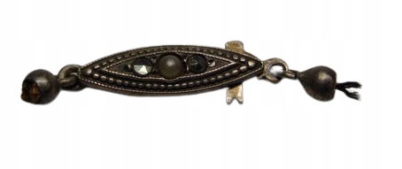 ДЕЛІКАТНА СРІБНА ПЕРЛИНА ТА ЗАЖИМ МАРКАЗИТ JKa VINTAGE. Застібка зі срібла 0,835 (проба та марка JKa) Вага 1,120 г. Розміри "прикраси" 0,44 х 1,5 см. «Висота» 3,5 мм. Винятковий стан, натуральна патина.