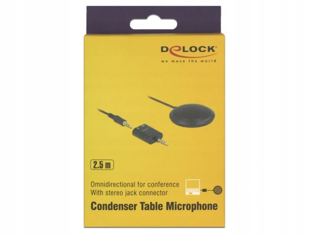 Delock 65873. Модель: Мікрофон таблиці, чутливість до мікрофона: -32 дБ, Частота мікрофона: 100 - 10 000 Гц. Технологія зв'язку: провідний, інтерфейс пристрою: 3,5 мм (1/8 "). Колір продукту: чорний, довжина кабелю: 2,5 м, країна походження: Китай. Висота продукту: 15 мм, діаметр: 6 см, вага мікрофона: 65,5 г. Тип пакету: коробка