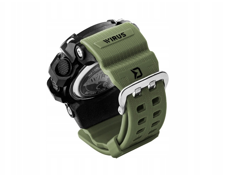 Гумовий ремінець зручний на дотик і регулюється, тобто годинник ідеально підходить для кожного зап'ястя. Темно-зелена смуга пасує до оточення. Корпус годинника чорний, міцний, має високу стійкість до зовнішніх механічних пошкоджень.
