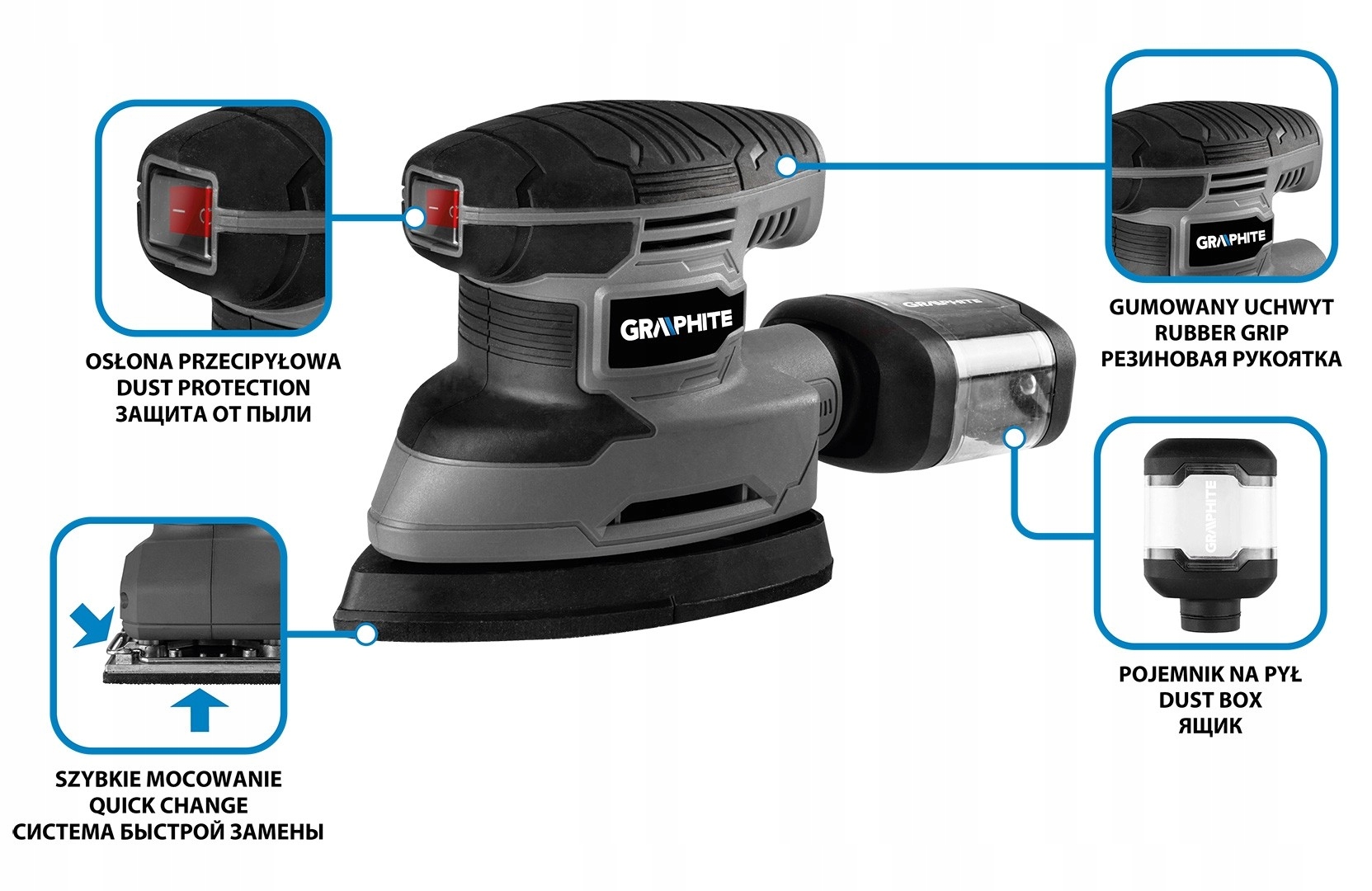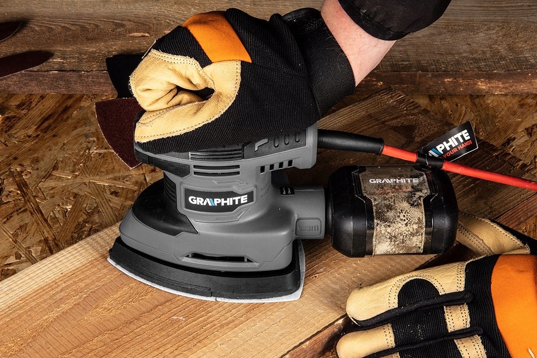 дельта 180 Вт коливальна шліфувальна машина, стопа 140 x 140 x 80 мм 59g336 за графітом - інструмент з 180 Вт у формі трикутника з розмірами 140 x 80 x 80 мм і сумісним абразивним папером 140 x 140 x 97 мм.