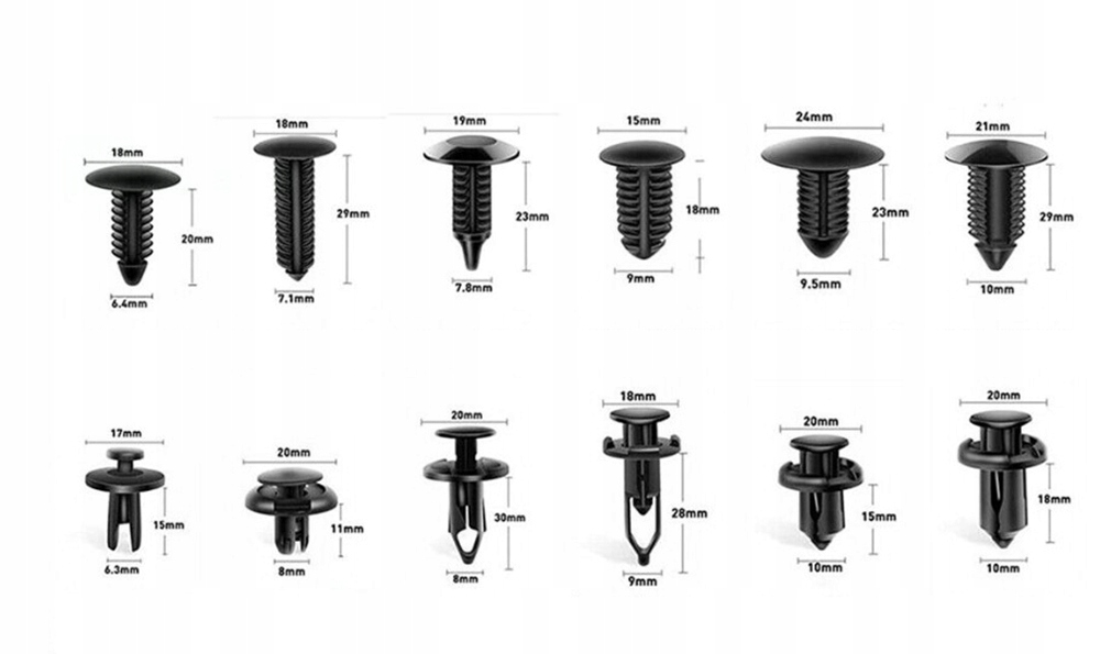 Набір фіксуючих штифтів включає 12 популярних розмірів, які підходять для заміни дверної панелі, хомута радіатора, крил, бампера та бризковиків на GM, Chrysler, Toyota, Honda тощо.