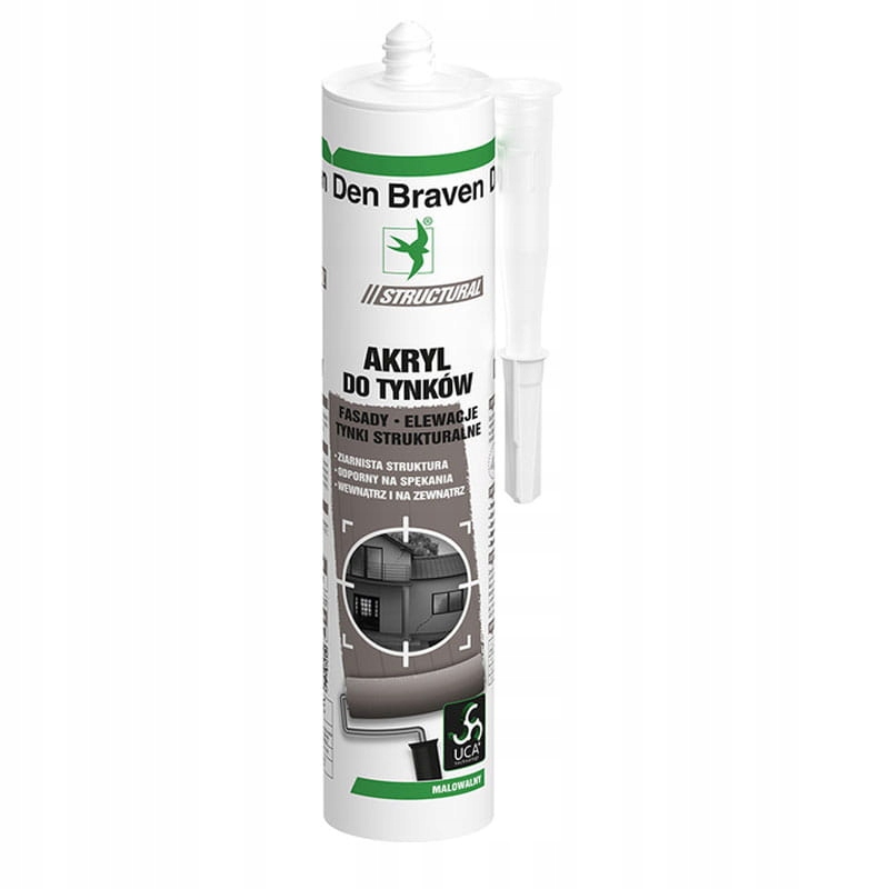 Den Braven Acrylic for Plasters — це високопластична та еластична герметизуюча шпаклівка на основі акрилової дисперсії на водній основі з частинками гравію, призначена для заповнення подряпин, швів і тріщин у структурних, мозаїчних штукатурках або штукатурках, нанесених шпателем, усередині приміщень та на відкритому повітрі