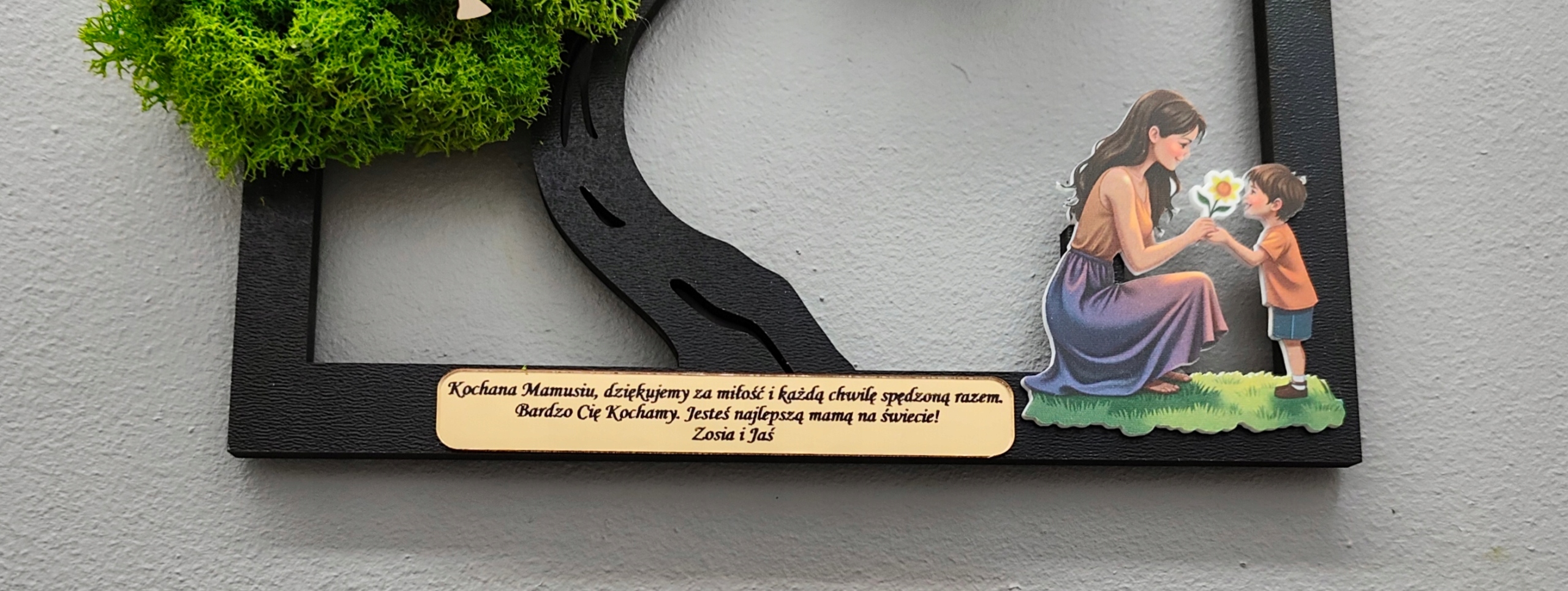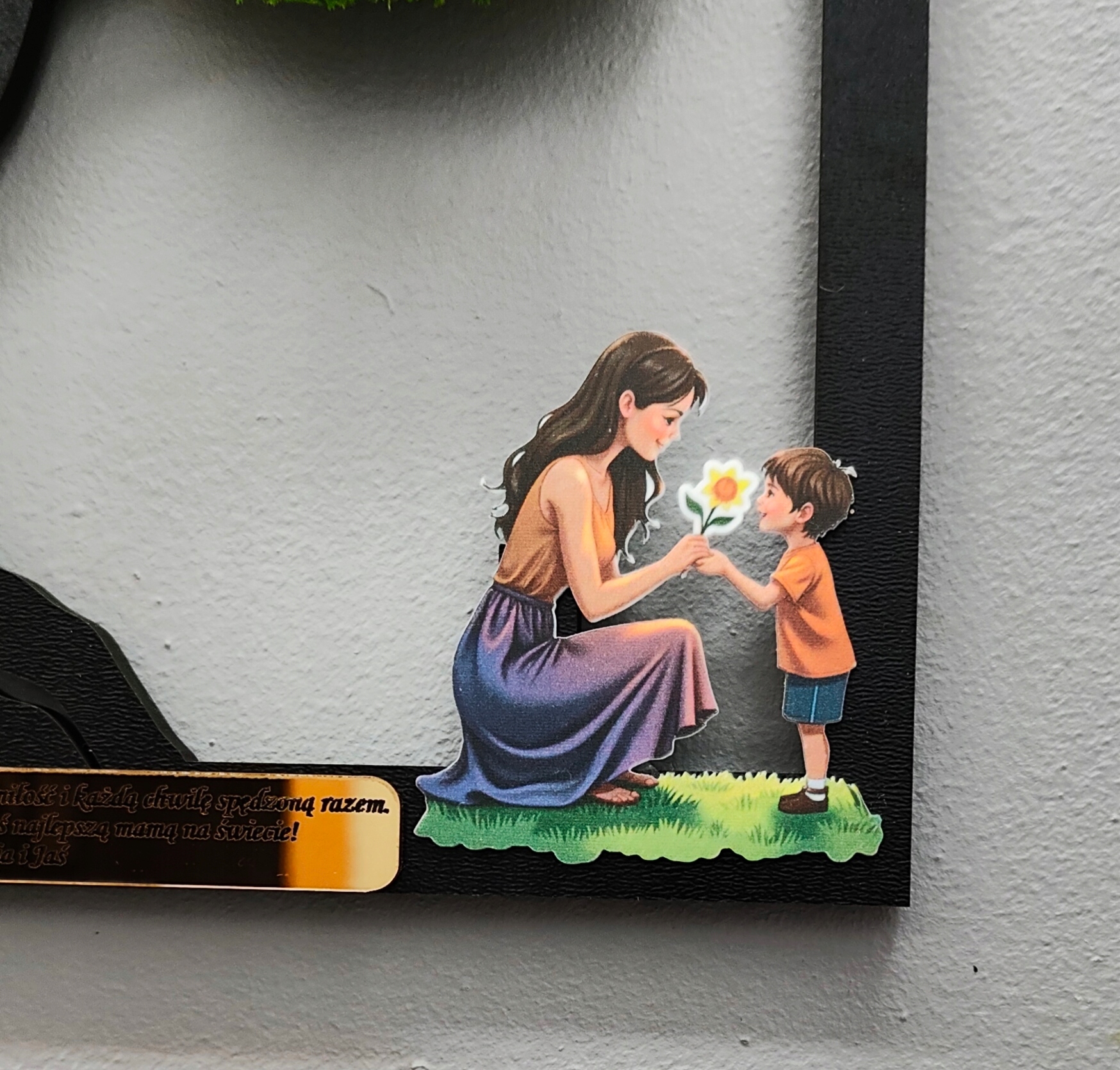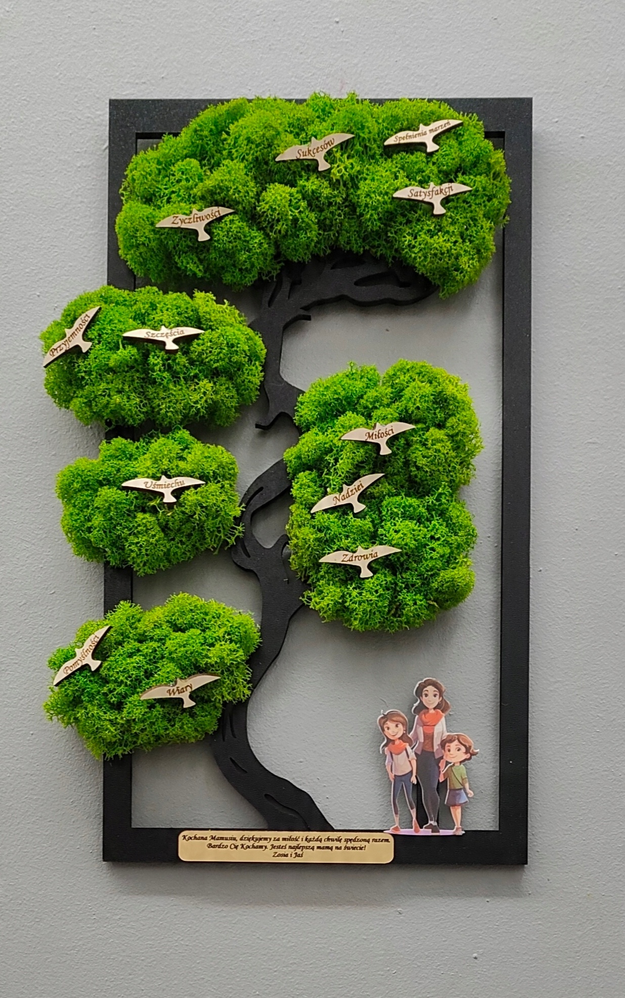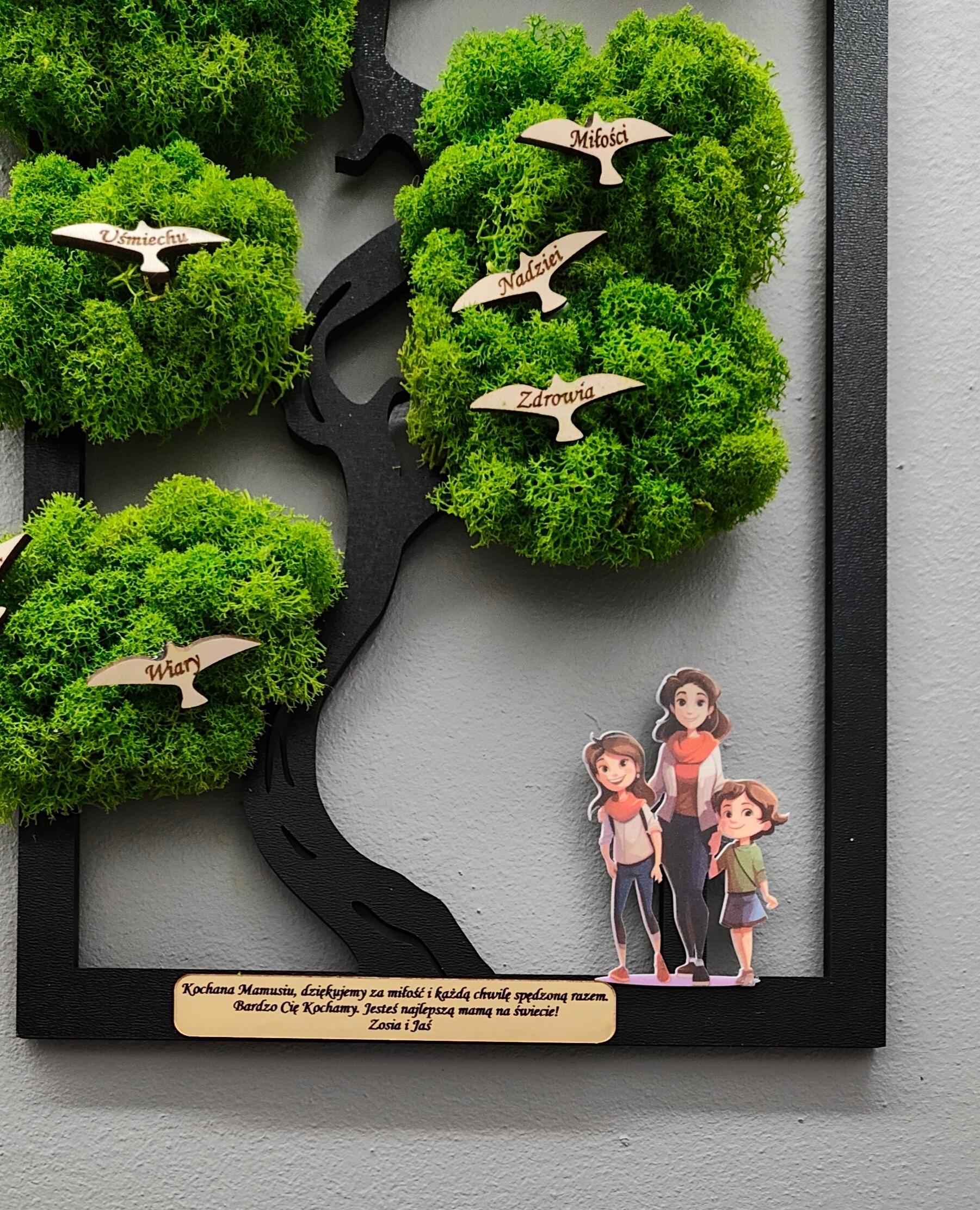 дерево, прикрашене мохом сміливим. Дерево інтегроване у вигляді матері з дитиною / дітьми - 30 конструкцій на вибір. Крім того, на рамці дерева ми розмістимо посвяти тарілку, виготовлену із золота / сріблястого дзеркала. Золоте/срібне дзеркало дає елегантність та чарівність. Гравірування в тарілці можна вільно змінити.