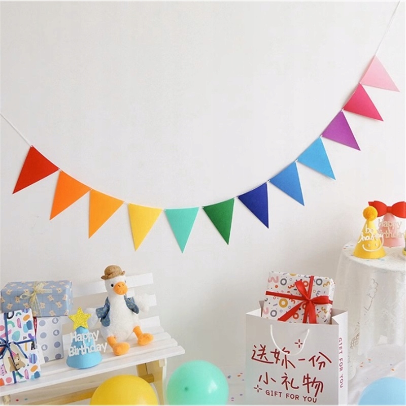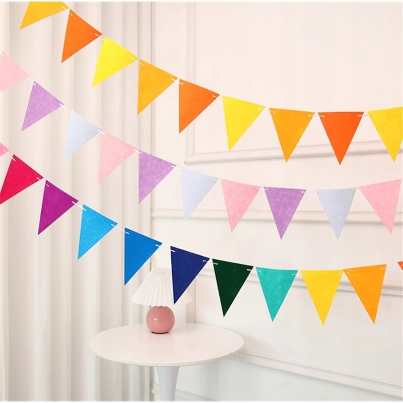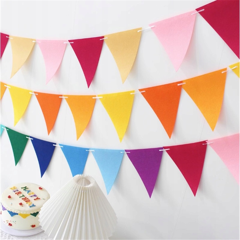 Набір містить 150 штук різнокольорових прапорців інтенсивних кольорів (червоний, жовтий, синій, зелений, рожевий), підвішених на міцній нитці довжиною 100 м. Готовий виріб - просто розгорніть і повісьте.