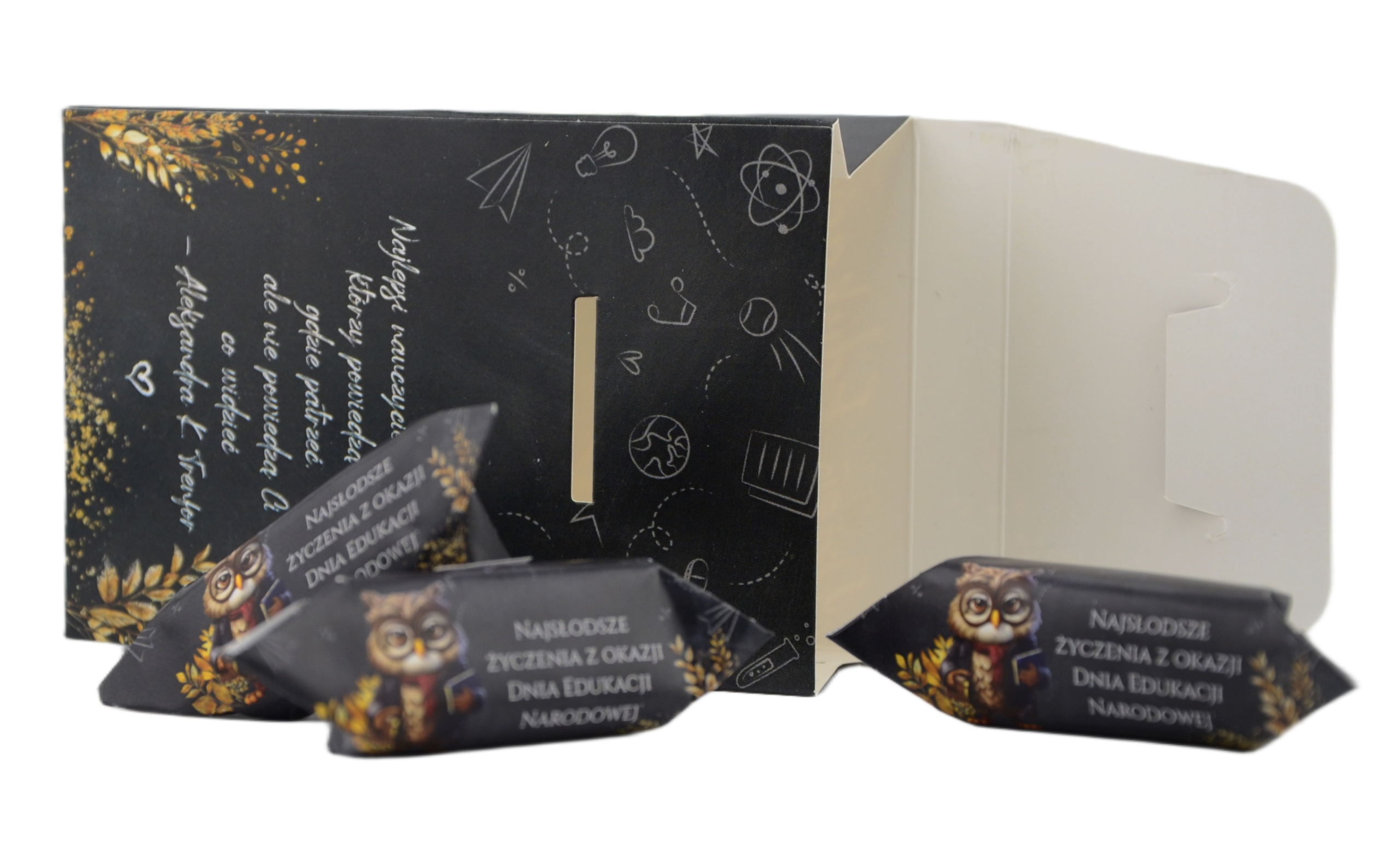 ⭐ У кожній коробці є 3 фальшини, смачні цукерки з молоком у паперах з написом "Найсолодші побажання з Дня національної освіти Окластії".