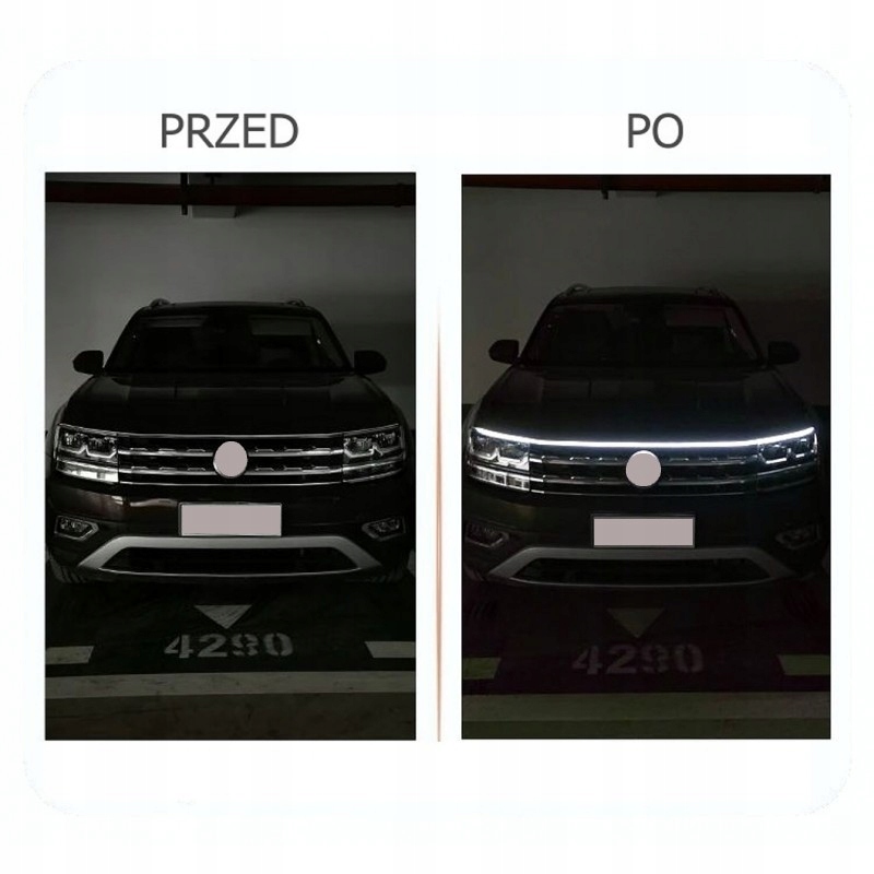 Дуже проста установка як до маски, так і переднього пояса. Стрічка є клеєм з обох боків. Ми просто приклеюємо вогні там, де хочемо. Важливо, щоб центр стрічки збігся з центром маски, і якщо стрічка занадто довга, ми приховуємо її з боків. Стрічку не можна вирізати, саме тому вона доступна в різній довжині від 0,6 м до 2,0 м.
