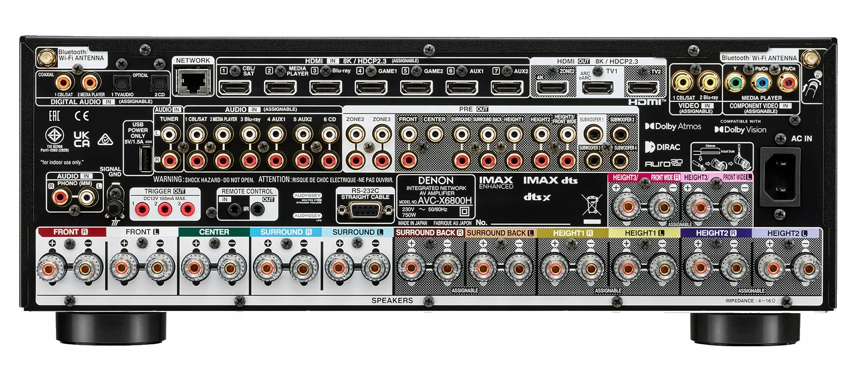 - AVC-X6800H пропонує 11,4 каналів посилення, 3D-аудіо, відео 8K і легендарний звук Denon із потужність 205 Вт на канал для забезпечення динамічних і детальних розваг. Крім того, AVC-X6800H оснащено виходами попереднього підсилювача з обробкою до 13,4 каналів.