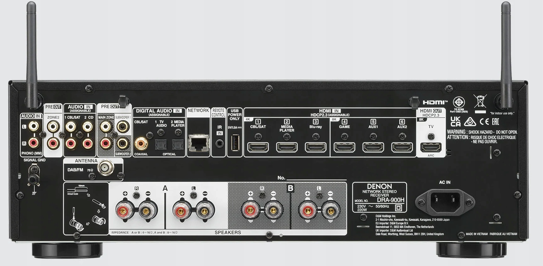 DRA-900H підтримує останні технології HDMI на входах та виході. ARC (аудіо -канал повернення) або EARC (вдосконалений канал зворотного аудіо -повернення) робить відтворення звуку з телевізора простим приймачем і вимагає лише з'єднання з одним кабелем HDMI.
