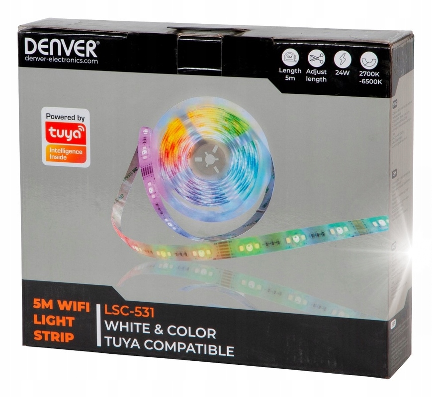 Ця 5 -метрована світлодіодна стрічка з Денвера забезпечує всебічне освітлення навколишнього середовища в сухих внутрішніх приміщеннях. Перш ніж запустити, смужку можна скоротити до необхідної довжини у помітних місцях. Він оснащений 90 світлодіодами на метр, які випромінюють барвисті або теплі -білі світло до білого дня денного світла і тьмяні. Крім того, кращі суміші можна зберегти як сцени за допомогою програми або ви можете встановити графіки для автоматичного управління. Розмивання, коригування кольорової температури або вибір раніше визначених сцен можливе за допомогою програми, а також використання голосових команд. Зв'язок між кінцевим пристроєм та ременем встановлюється через WLAN.