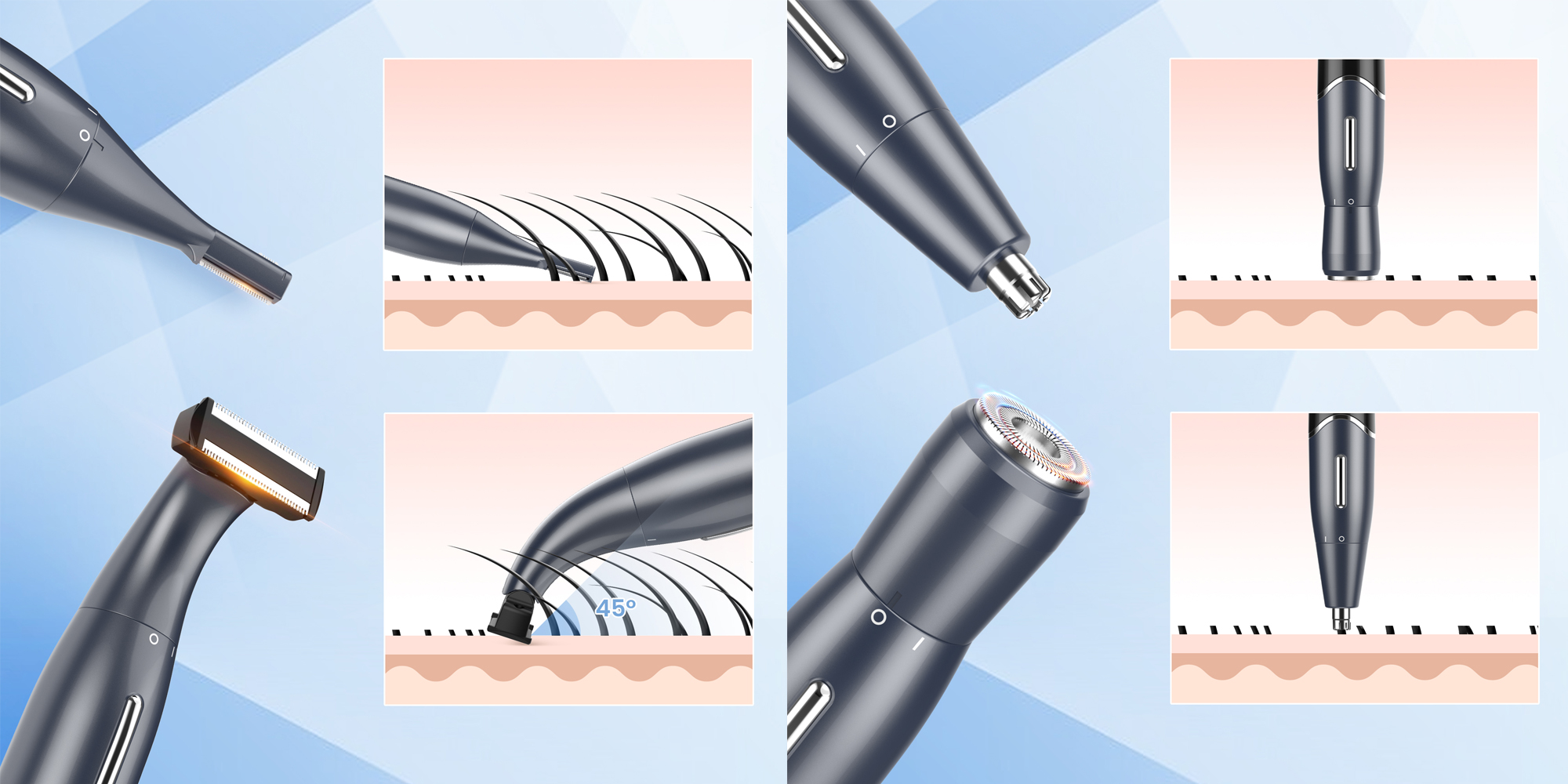 ✨ Обережно покладіть головку тримера на шкіру та повільно рухайте нею по волокну. Особливо підходить для видалення волосся на обличчі.