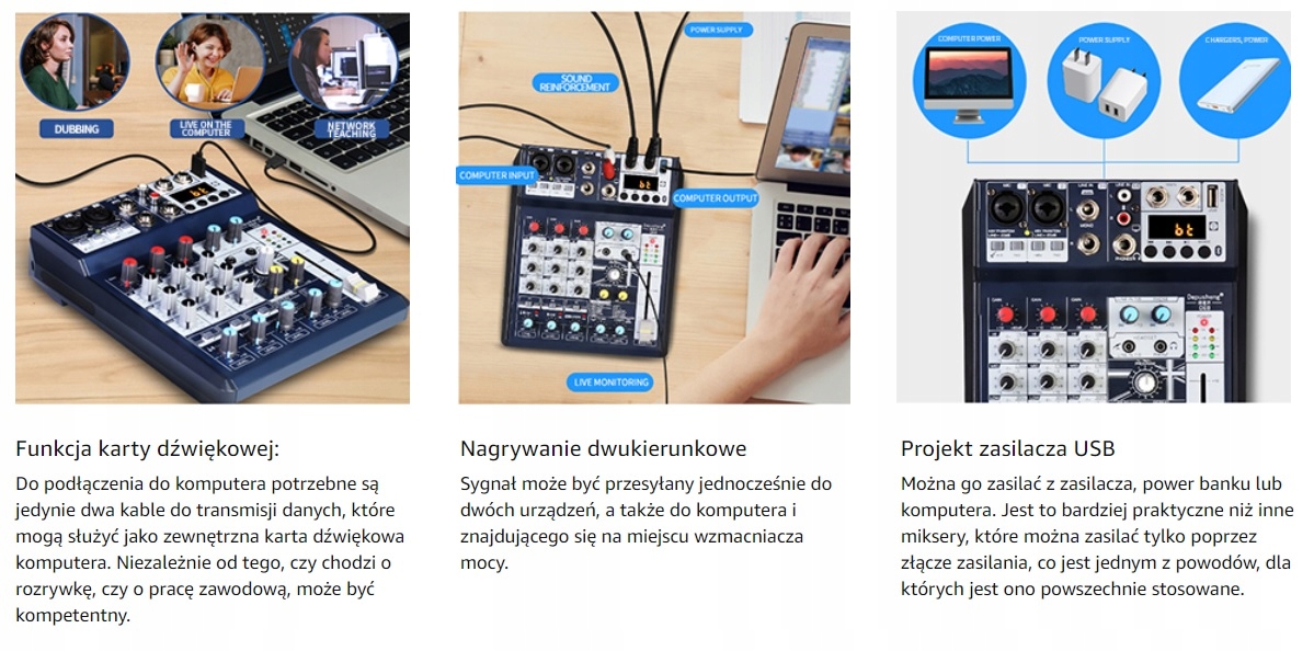 - Простий запис і підключення до комп’ютера: цей чутливий мікшер містить звукову карту USB і аудіоінтерфейс для запису та підключення до MAC або ПК. і може працювати з універсальними цифровими аудіофайлами. Сумісність неймовірна, і її можна використовувати як для початківців, так і для професійних студій.
