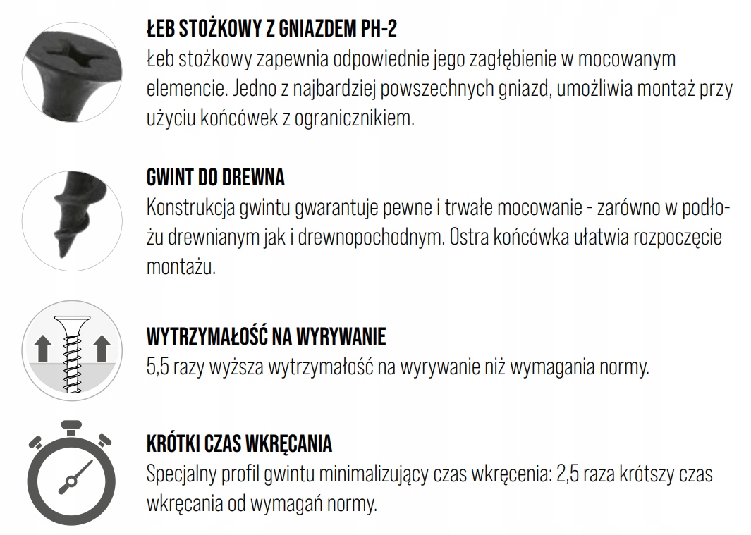 - Гострий наконечник гвинта робить збірку ще простішим і швидшим - без необхідності свердлити раніше. Він ідеально входить у матеріал, який економить ваш час і зусилля.