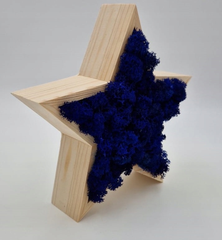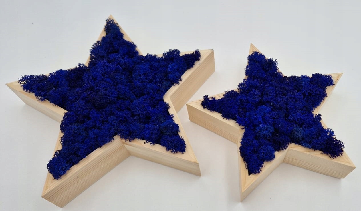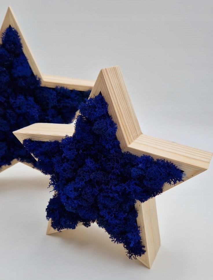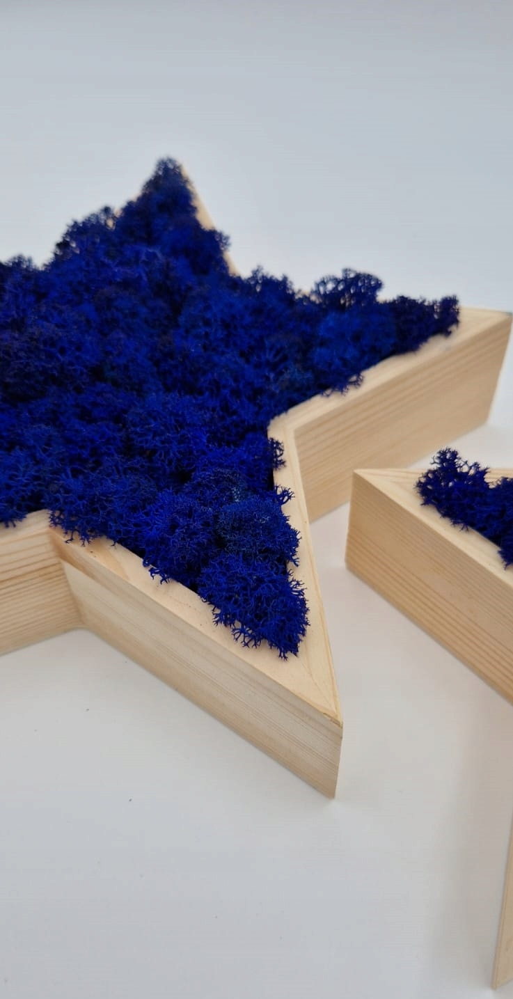 Набір із 2 дерев’яних зірок, наповнених блакитним (темним кольором) фінським мохом, Reindeer Crabgrass.