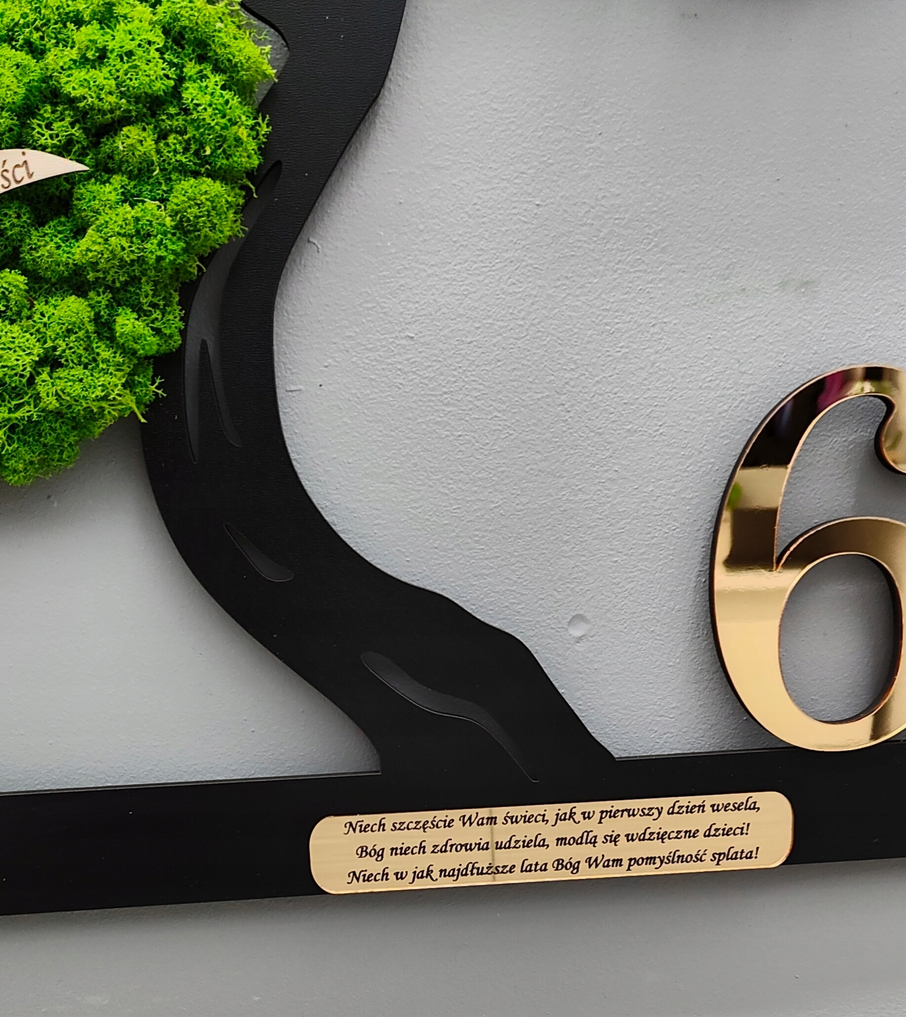 Дерево, прикрашене мохом. Будь-яка цифра із золотого/срібного дзеркала включена в дерево. Додатково розмістимо табличку з присвятою на ялинковому каркасі, виготовленому із золотого/срібного дзеркала. Золоте/срібне дзеркало додає елегантності та шарму. Гравірування на тарілці можна вільно змінювати.