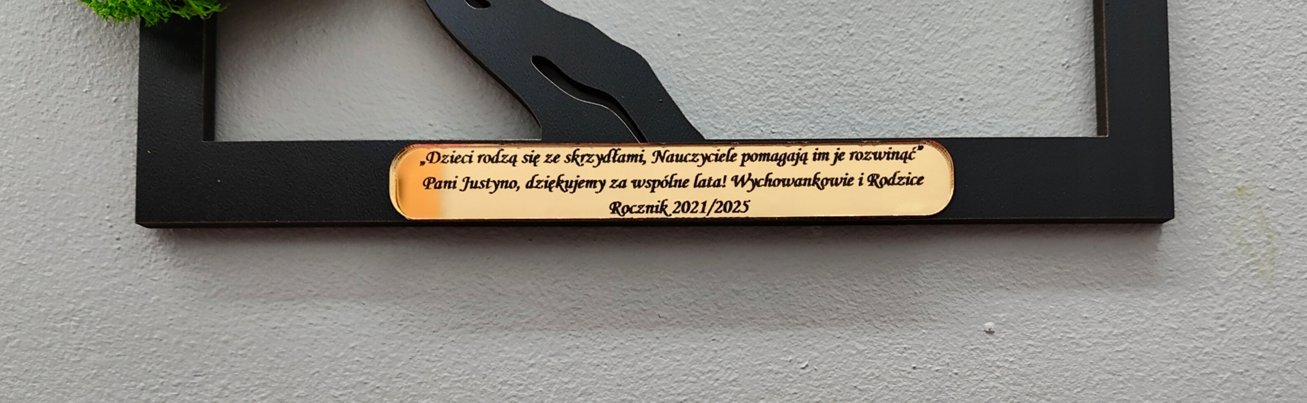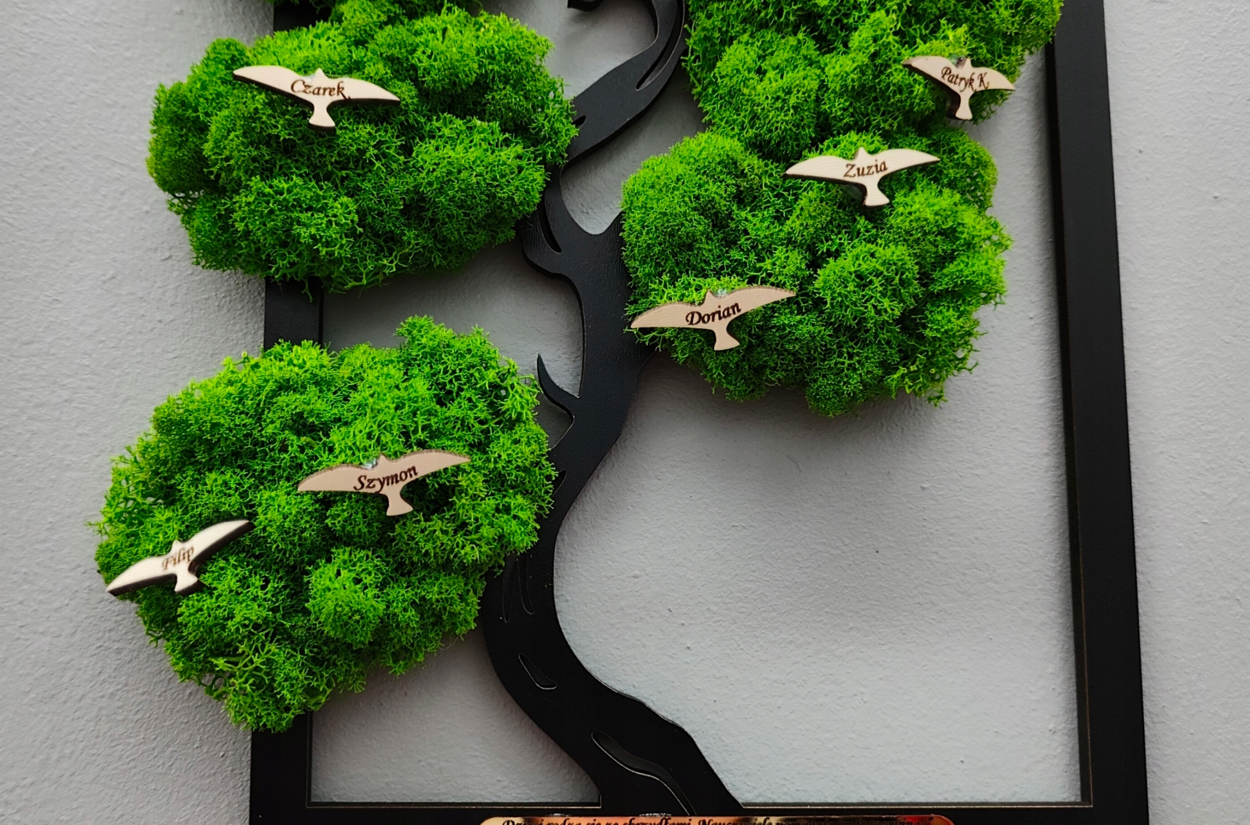 дерево, прикрашене мохом сміливим. У птахів є імена дітей або, наприклад, побажання. Крім того, декоративна табличка приклеєна під деревом, виготовлене із золота / сріблястого дзеркала. Золоте/срібне дзеркало дає елегантність та чарівність. Гравірування в тарілці можна вільно змінити.
