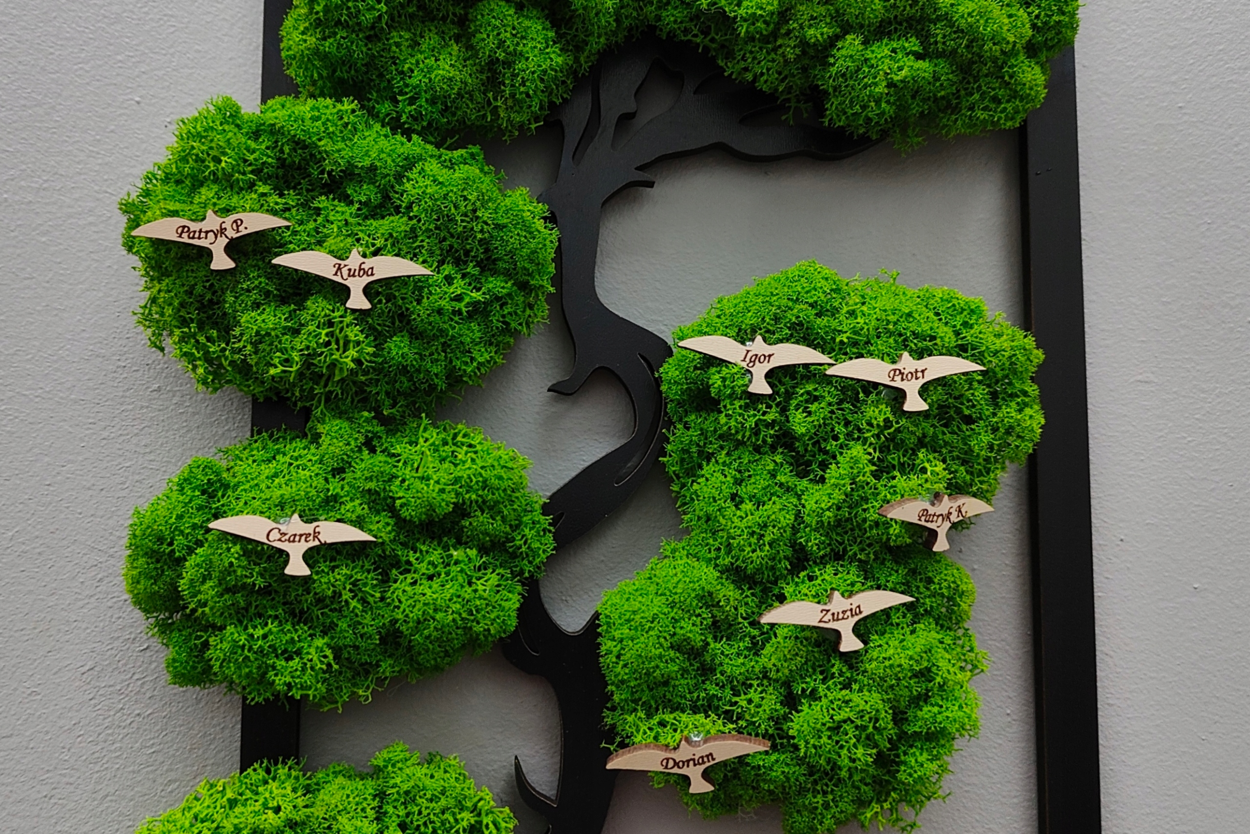 дерево, прикрашене мохом сміливим. У птахів є імена дітей або, наприклад, побажання. Крім того, декоративна табличка приклеєна під деревом, виготовлене із золота / сріблястого дзеркала. Золоте/срібне дзеркало дає елегантність та чарівність. Гравірування в тарілці можна вільно змінити.