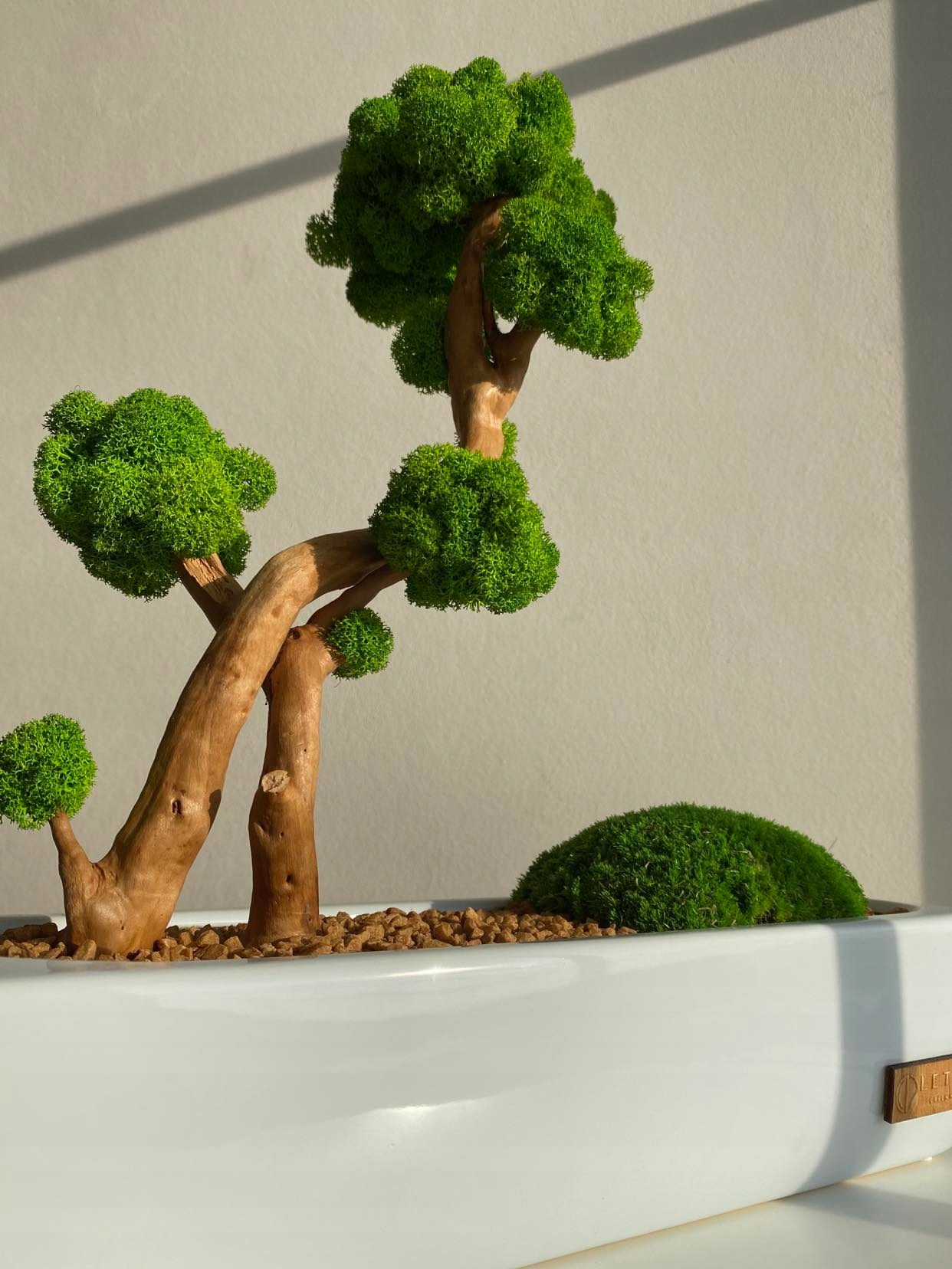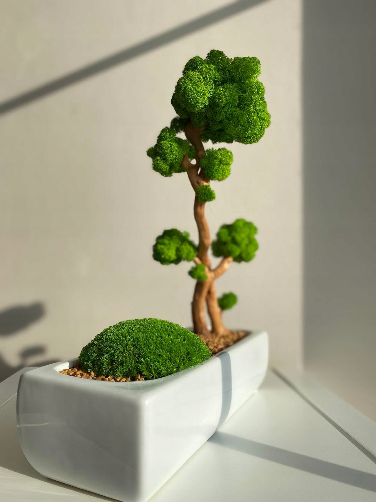 дерево мох бонсай, подарунок преміум, мох хроботка, білий горщик