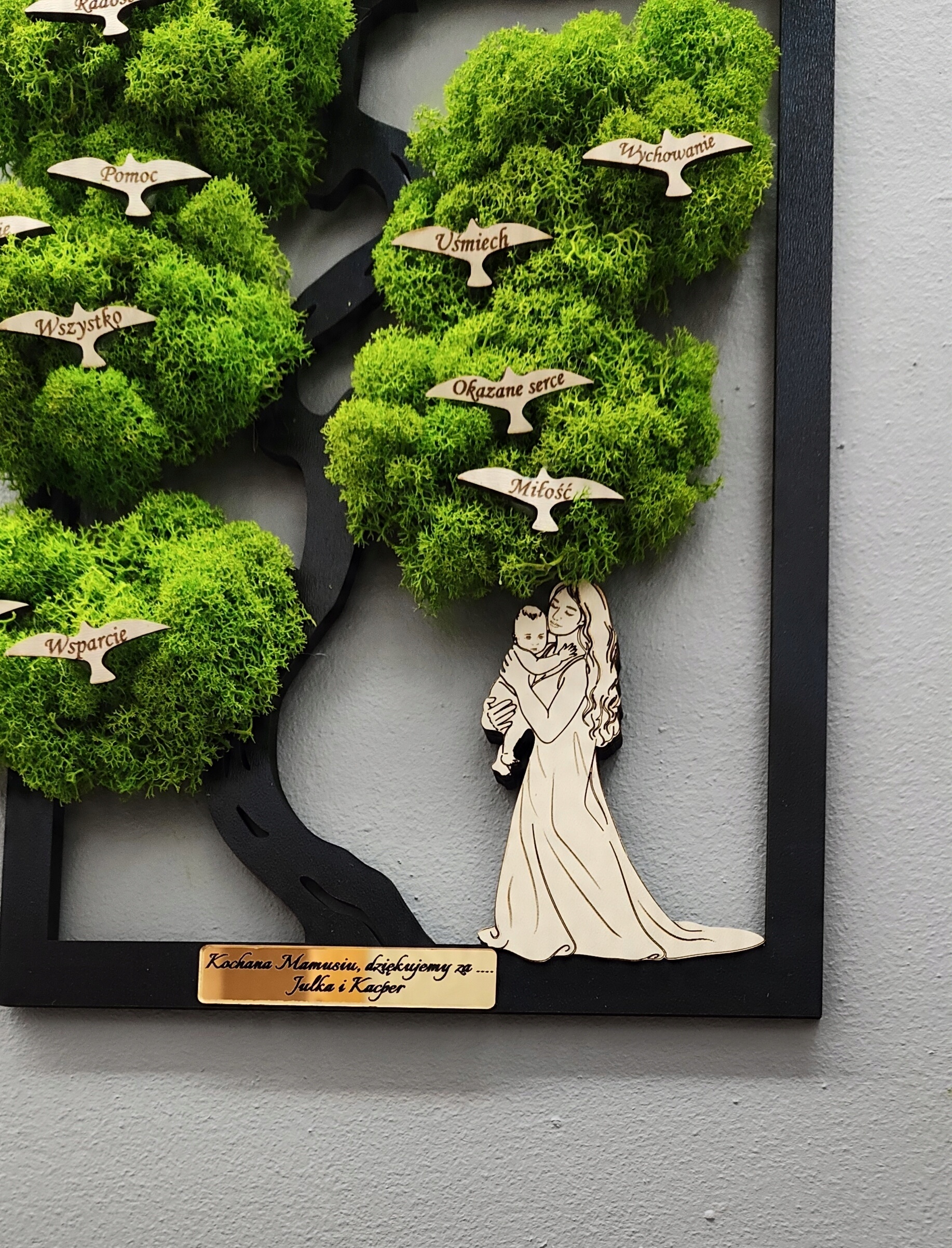 Бонсай - дерево щастя в подарунок до Дня Матері - 26 травня. Дерево прикрашене мохом. У дерево вбудована символічна фігура матері та дитини. Додатково оправу прикрашає красива незвичайна табличка із золотого дзеркала. Золоте дзеркало надає елегантності та шарму. Гравірування на тарілці можна довільно змінювати.