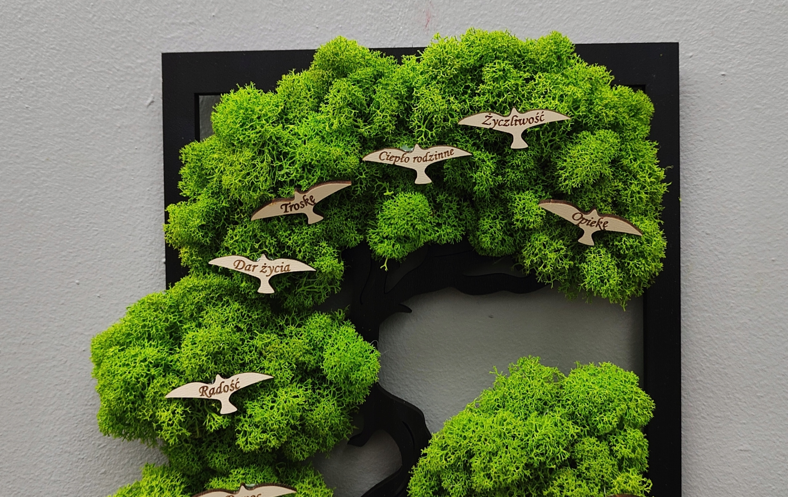 Стабілізований мох, який використовується для дерева, є чудовим лишайником - він повністю не вимагає обслуговування. Його не потрібно обрізати і поливати. Для життя йому потрібна лише волога з повітря, яку він сам поглинає. Він може залишатися свіжим до 11 років.