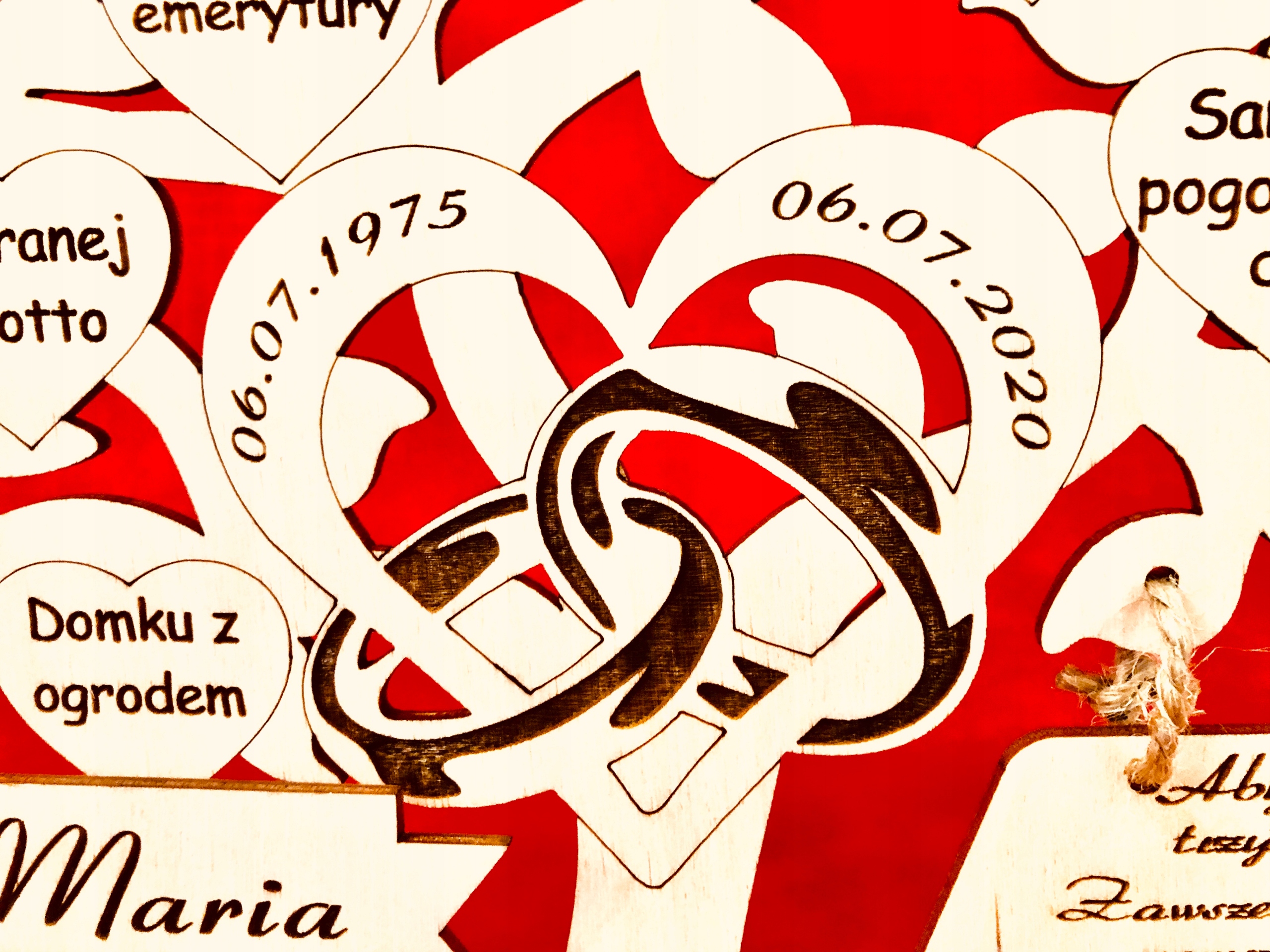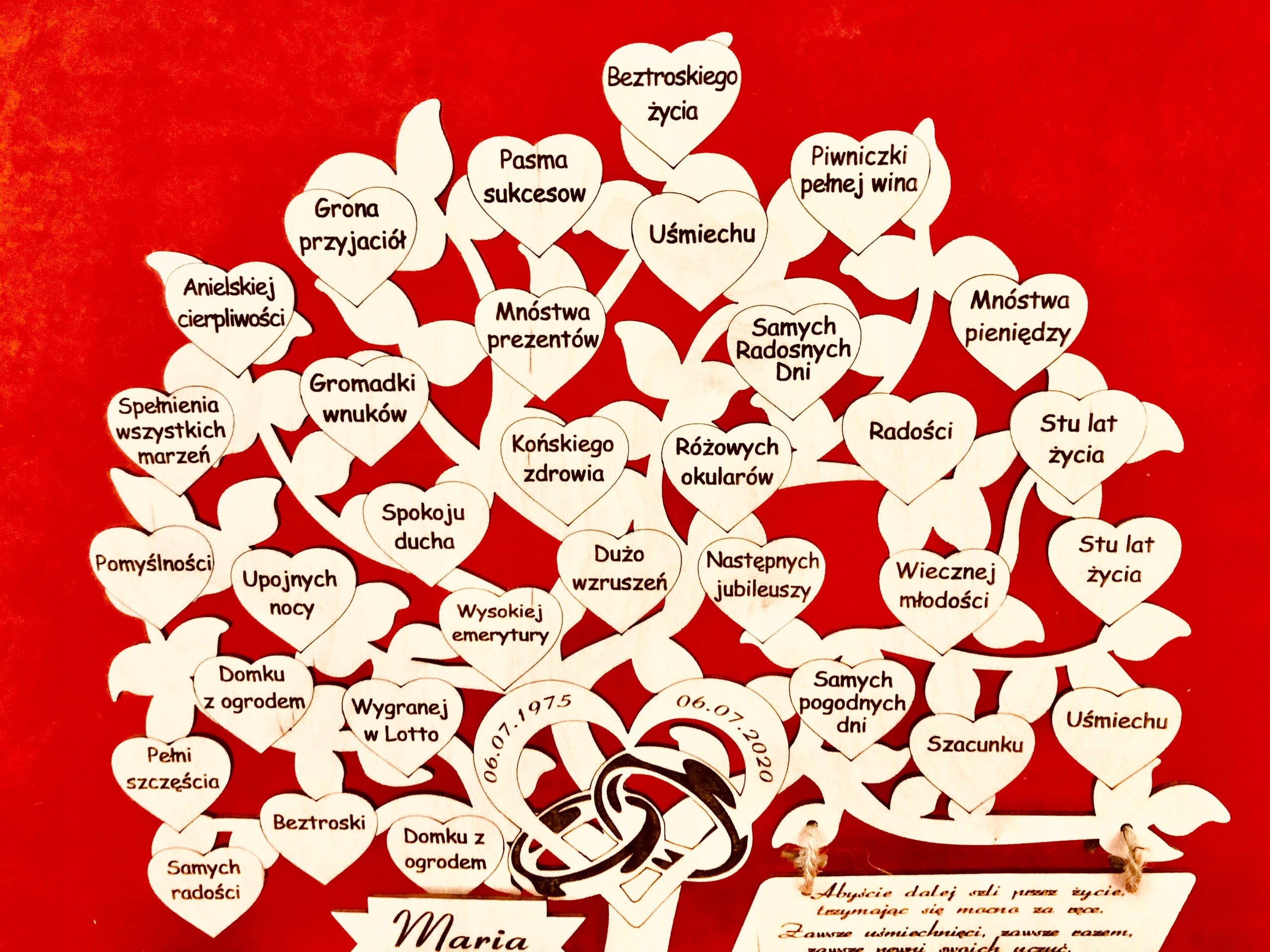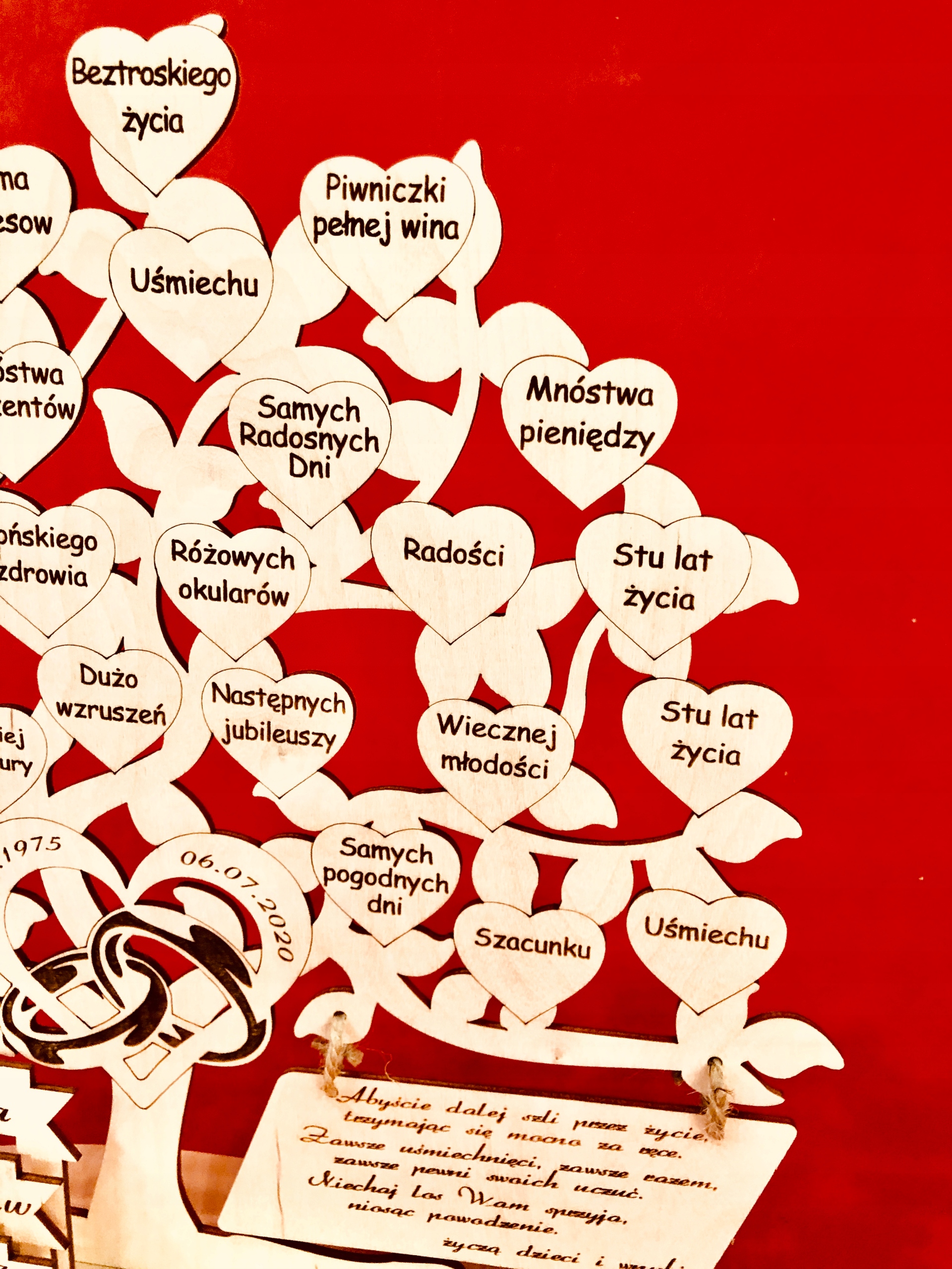 Крім приказок на сердечках, ми розмістили імена іменинників та інформацію про річницю весілля на вирізаних та прикріплених до основи табличках.
