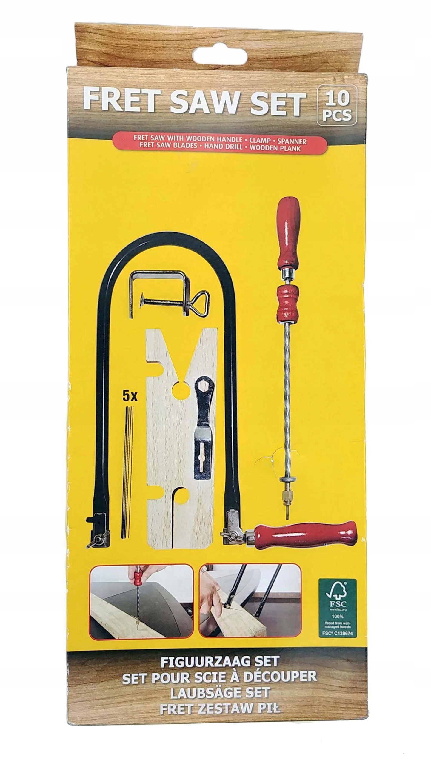 - набір включає: 1 x волосяна пила (лобзик) з дерев’яною ручкою (висота пилки 33 см), 1 x металевий затискач, 1 x дерев’яна шайба/дошка, 1 x гайковий ключ для тримача/лобзика, ручна дриль / свердло 28 см зі свердлом, 5 пилок / полотен для лобзика довжиною 15 см,