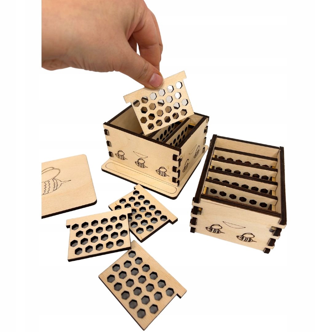 Перший елемент - це репліка вулика, що складається з двох ящиків із шматочками меду, накладкою та кришкою з розміром 20x10 см. Переміщення елементів вулика дають можливість грати в творчу гру у пасічнику, навчити невеликі моторики та навчити точності.