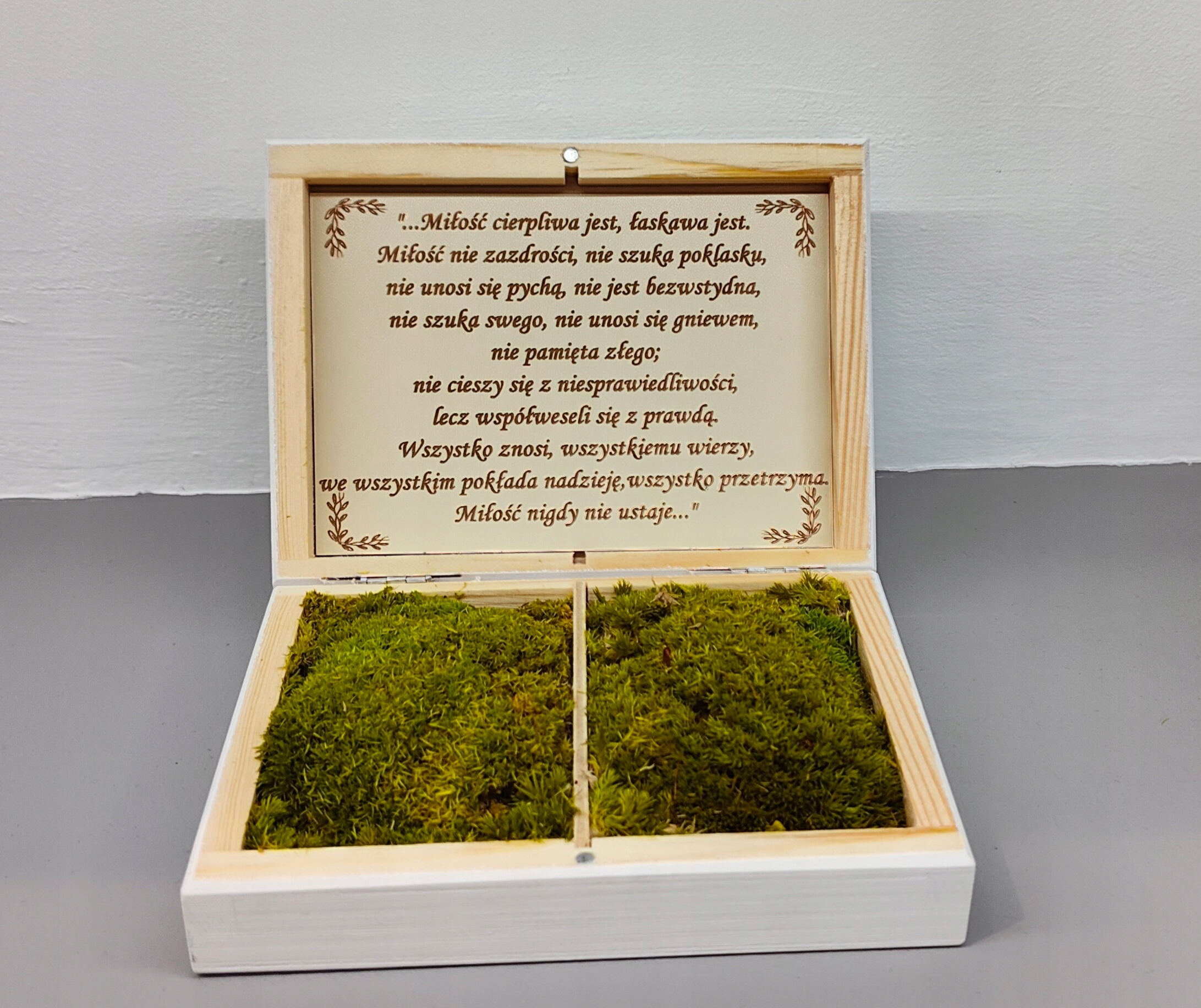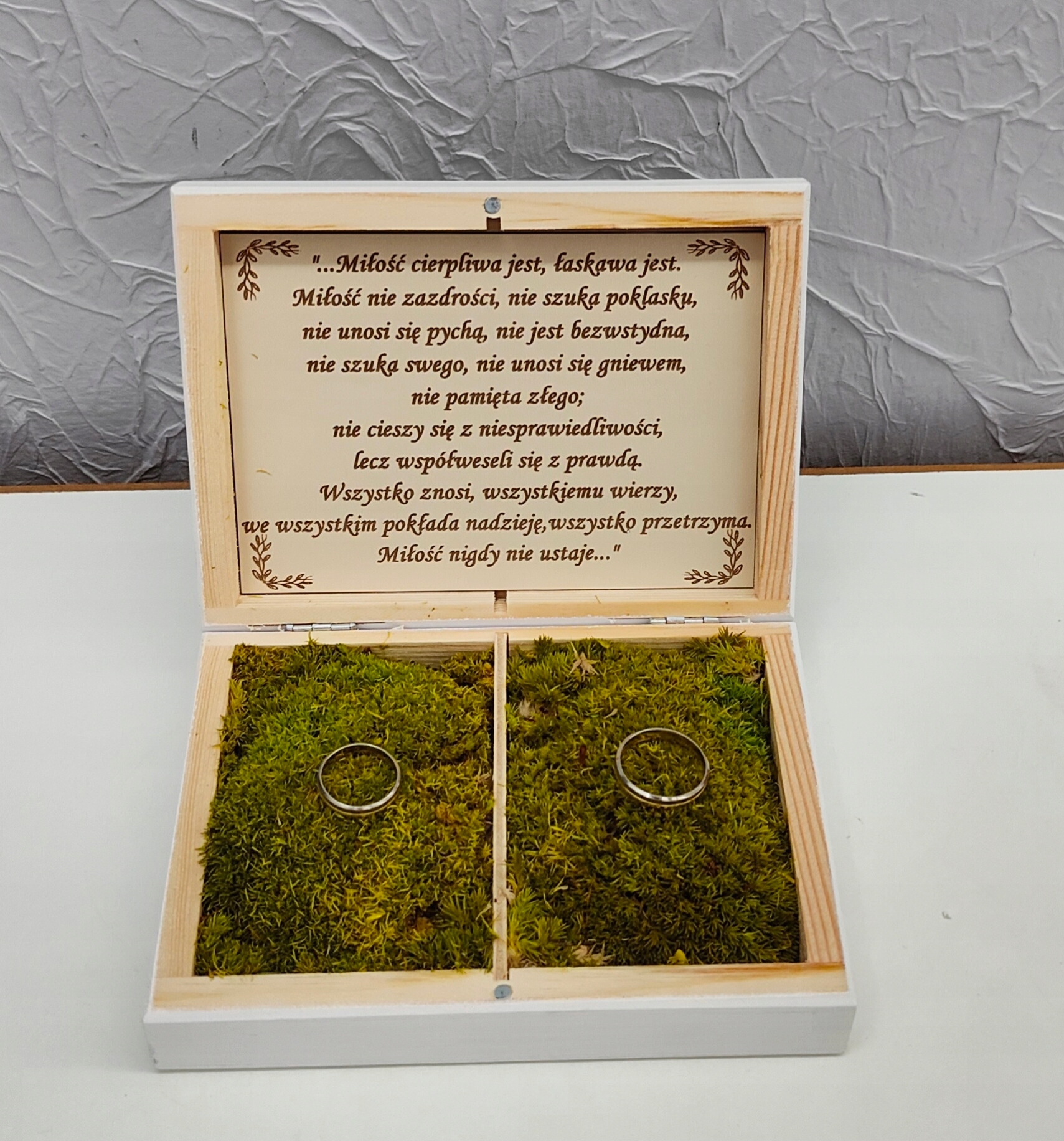 Коробка має 2 камери всередині, заповнені стабілізованим мохом-подушкою. Помістіть свої обручки на цю м’яку подушку з моху. Під кришкою речення – Гімн кохання.