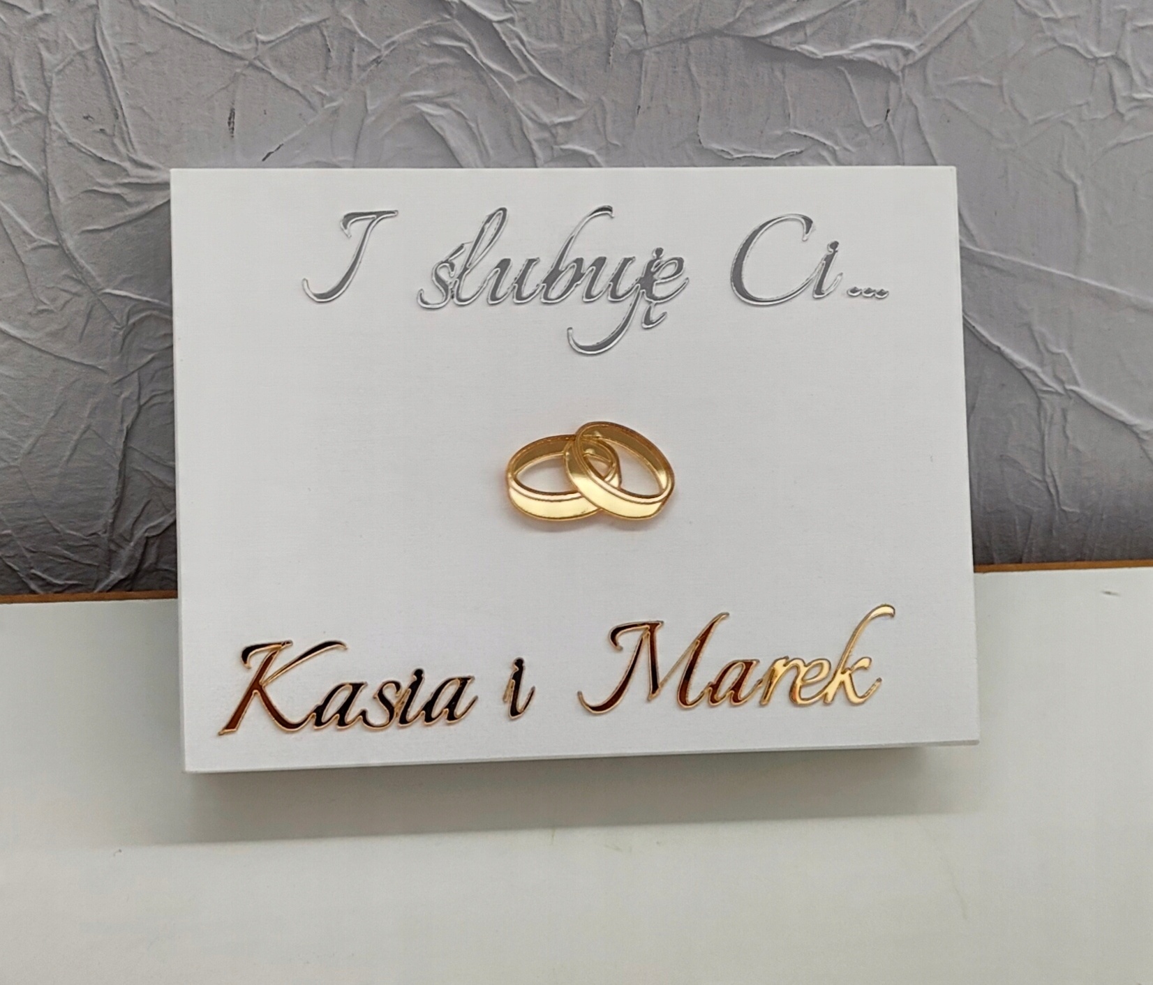 На цьому аукціоні ви купите білу скриньку для обручок. На кришці зроблений срібним дзеркалом напис «Клянусь тобі», а з золотого дзеркального оргскла — імена молодят. Гравіровані обручки також виготовлені з 3-міліметрового золотого дзеркального оргскла.