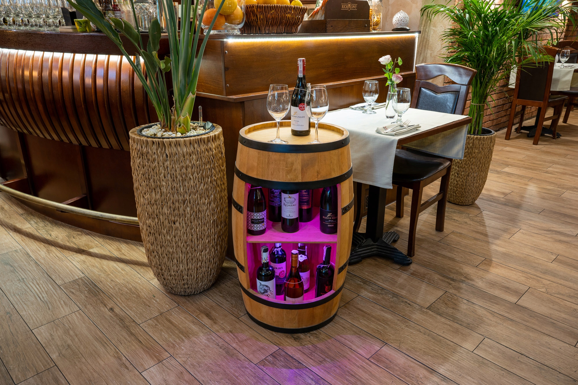 Стильний міні-бар з дерев'яної бочки, ексклюзивний і практичний предмет меблів для дому та бізнесу. Варіант із світлодіодним підсвічуванням RGB, керованим дистанційним керуванням.
