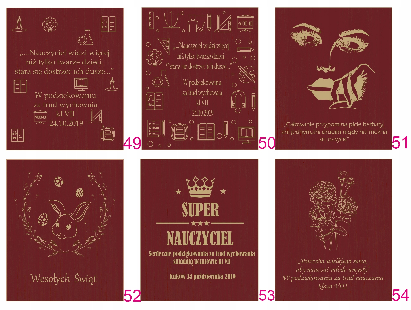 Текст вигравірувано на зовнішній стороні коробки. Клієнт може вибрати малюнок гравіювання (один з наступних) та персоналізований вміст імен, дат, написів тощо (відповідно до шаблону), який необхідно надіслати в повідомленні продавцю.