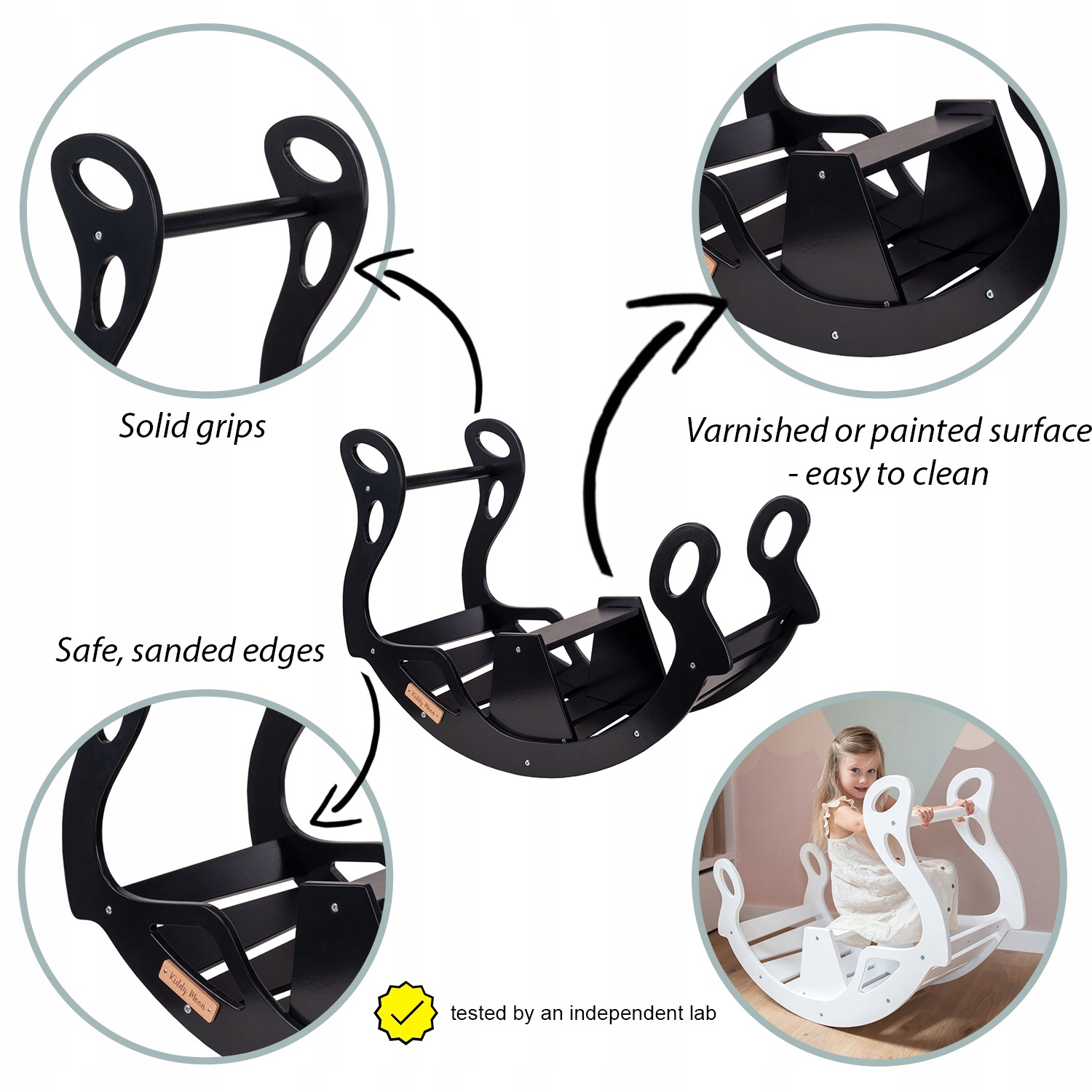 Виріб займає небагато місця та був розроблений, щоб доповнити декор дитячої кімнати. Він має стілець, який дозволяє зручно розгойдуватися в різних темпах, і поручень, який забезпечує безпечне використання. Виготовлений з фанери, його вага становить 6,4 кг, що забезпечує стабільність і не є занадто важким для дорослих. Крім того, прикріплені ручки полегшують пересування по підлозі або траві.
