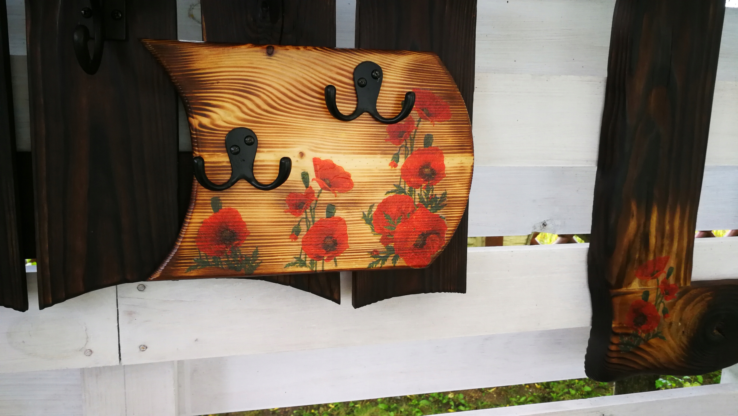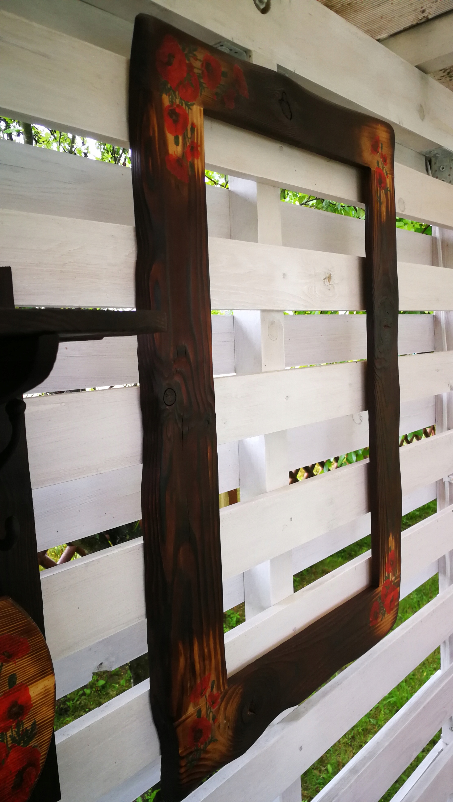 ремісничий. Дзеркальна рама була виготовлена з соснової деревини, яка була постаріла і засмагла. Квіткові мотиви застосовували за допомогою методу Decoupage. Весь нарешті був сплетений деревним воском. Такий спосіб оздоблення дзеркальної рамки забезпечує його довголіттям, підкреслюючи прекрасну конструкцію деревини та унікальний вигляд.