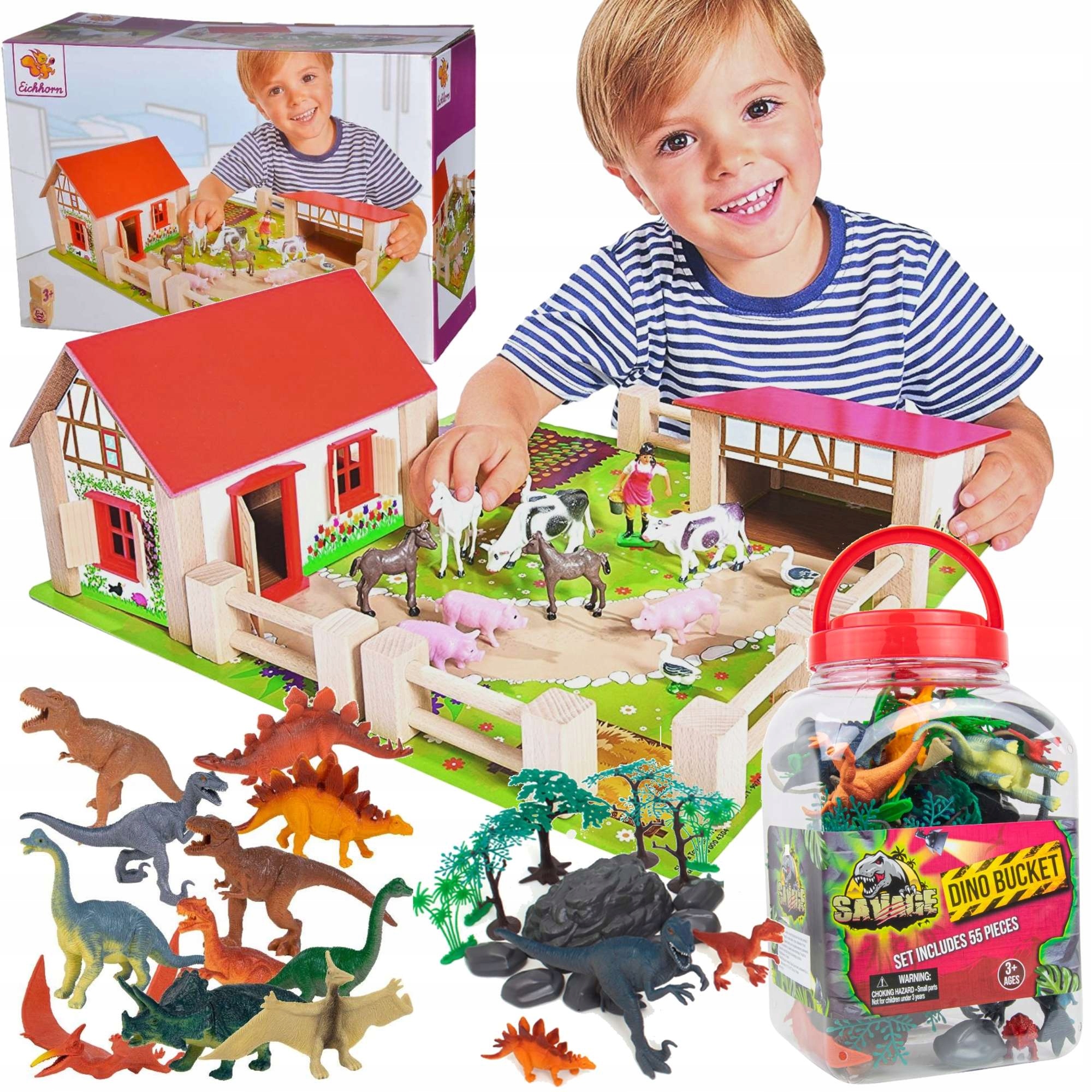 Набір дерев'яних ферм Eichhorn 23 елементи + набір диких фігурок динозаврів у контейнері 55 елементів