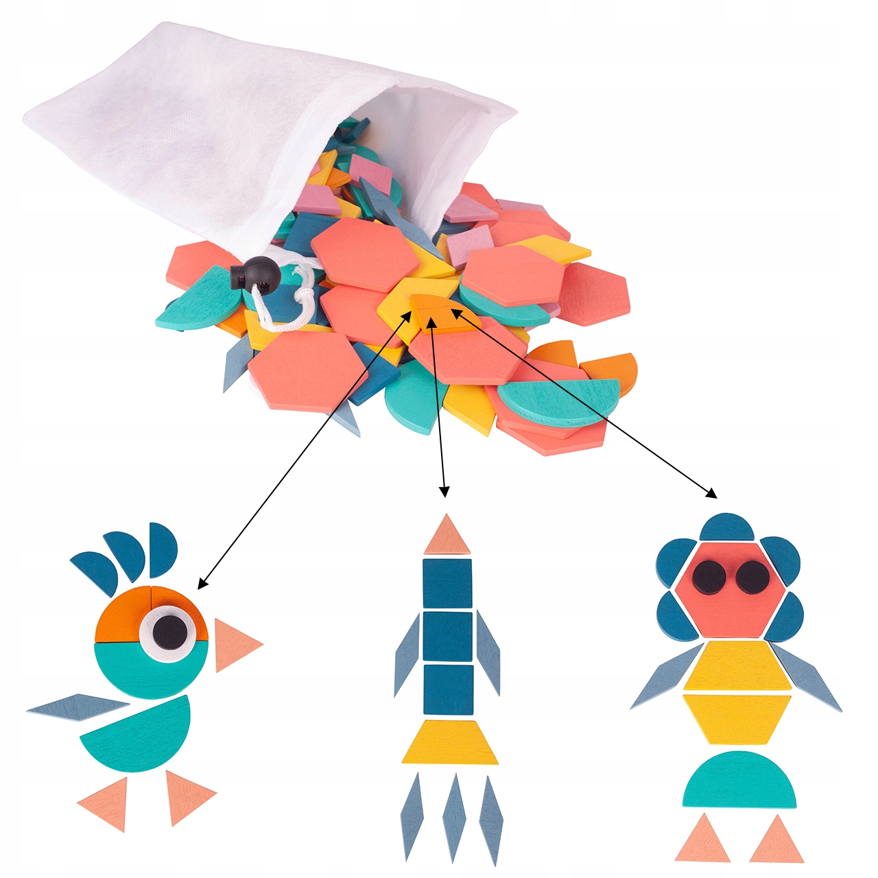 Іграшка допомагає в загальному розвитку дітей у багатьох сферах. Він активізує почуття, стимулює уяву та творчість. У набір входять картки - просто розкладіть блоки відповідно до малюнків, намальованих на картках. Картки мають різні рівні складності. Всі елементи можна упакувати в сумку, що входить в комплект.