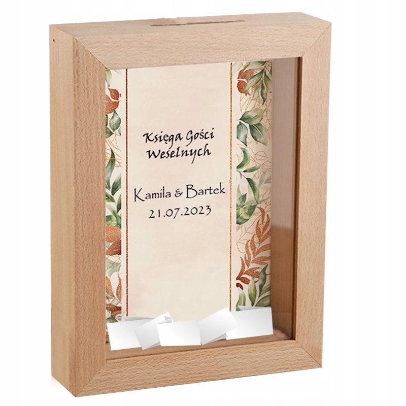 Оригінальна ідея для книги весільних гостей - 3D -скарбничка з декоративною наклейкою в наборі з нотами. Якщо ви шукаєте унікальну книгу, ви щойно її знайшли - прекрасну рамку з простором для дерев’яних сердець, які гості можуть підписати з іменами.