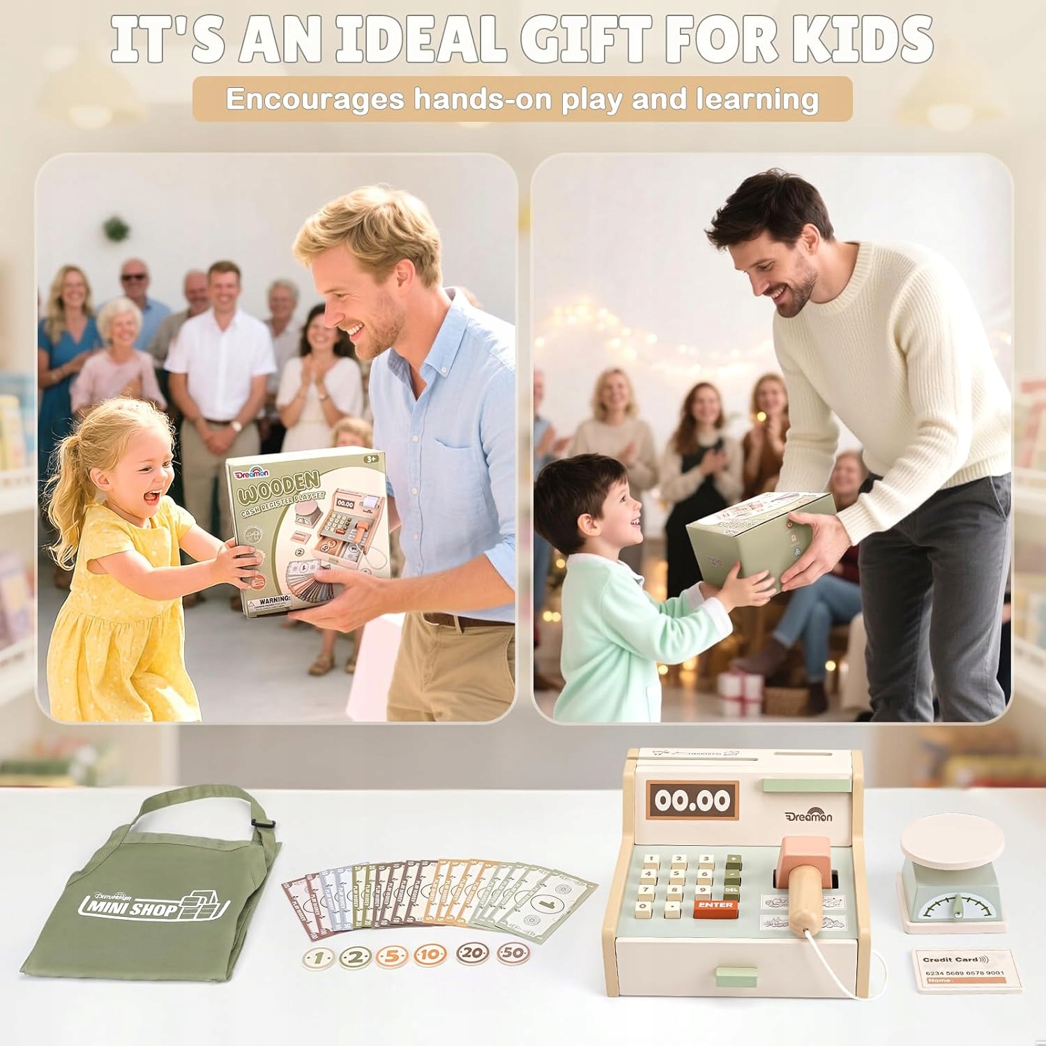 Цей дерев'яний ігровий касовий апарат дозволить вашій дитині грати роль касира та керувати власним магазином! 🧾 У набір входить сканер, ваги, монети, банкноти, кредитна картка та фартух - все, що потрібно для творчого шопінгу. 🛒