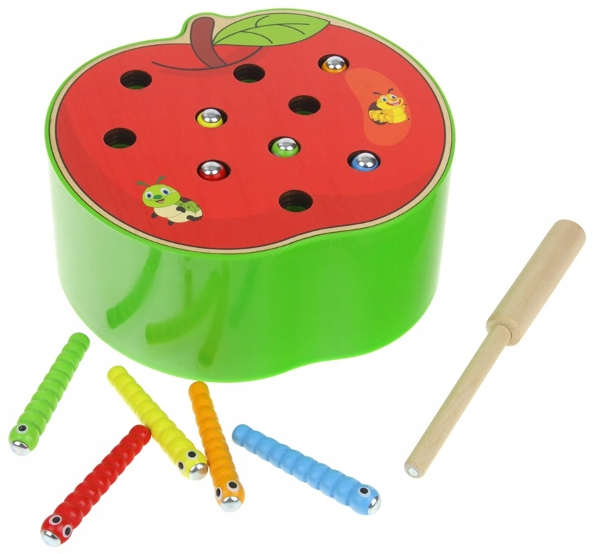 ✔️ Гра полягає в тому, щоб ловити черв’яків, захованих у отворах у фруктах, за допомогою дерев’яної палички з магнітом, а потім знову вставляти їх. Це велике випробування для малюка, яке вимагає зосередженості та спритності рук.