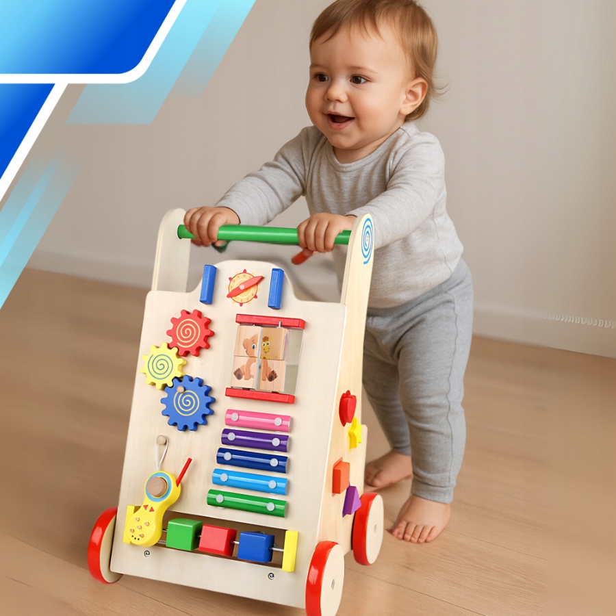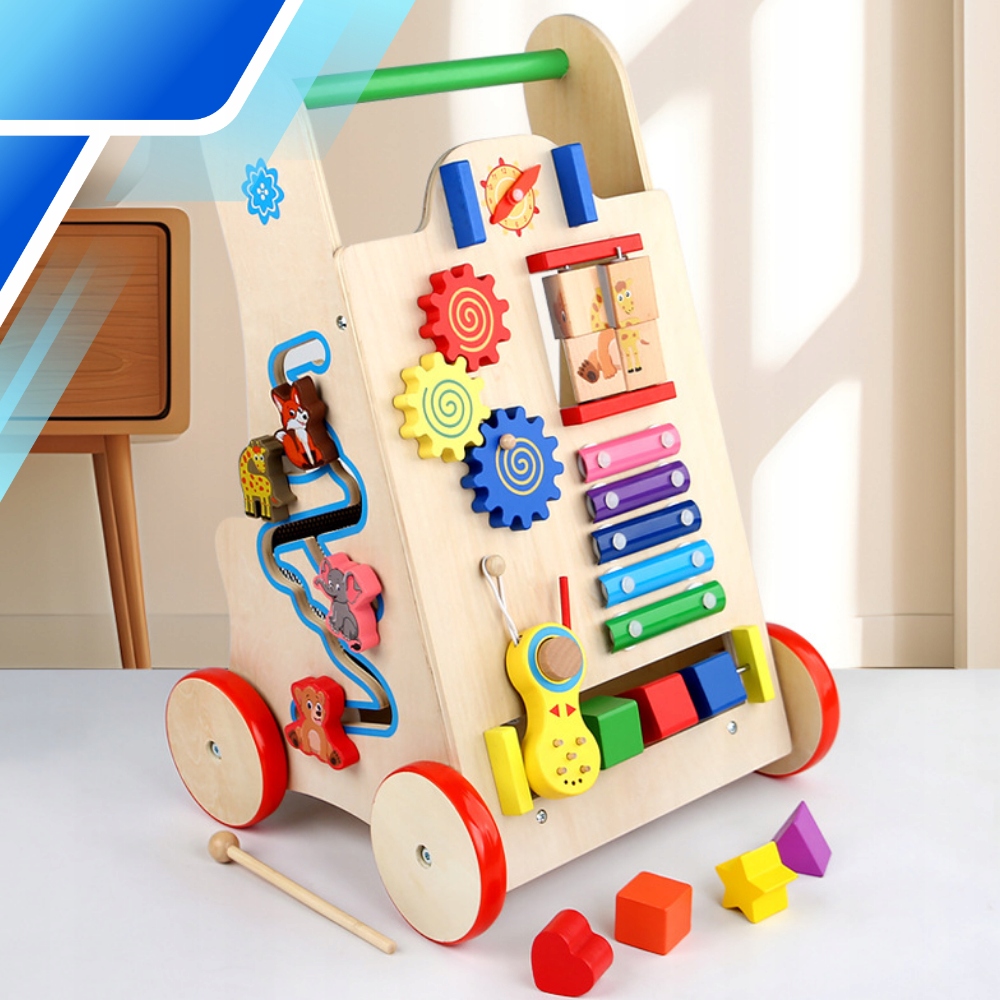 Цей барвистий навчальний дерев'яний штовхач — ідеальна іграшка для малюків, які роблять перші кроки. Міцна конструкція забезпечує безпеку, а численні навчальні функції розвивають мануальні, когнітивні та музичні навички дитини.