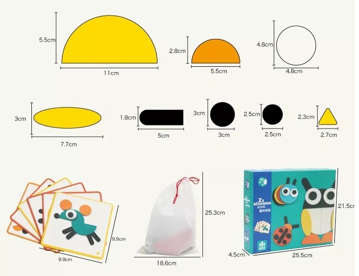 Набір складається з 29 дерев'яних різнокольорових елементів різної форми, з яких можна складати різні фігурки, тварин, напр. лисичка, краб, метелик та багато інших - єдиним обмеженням є наша уява.