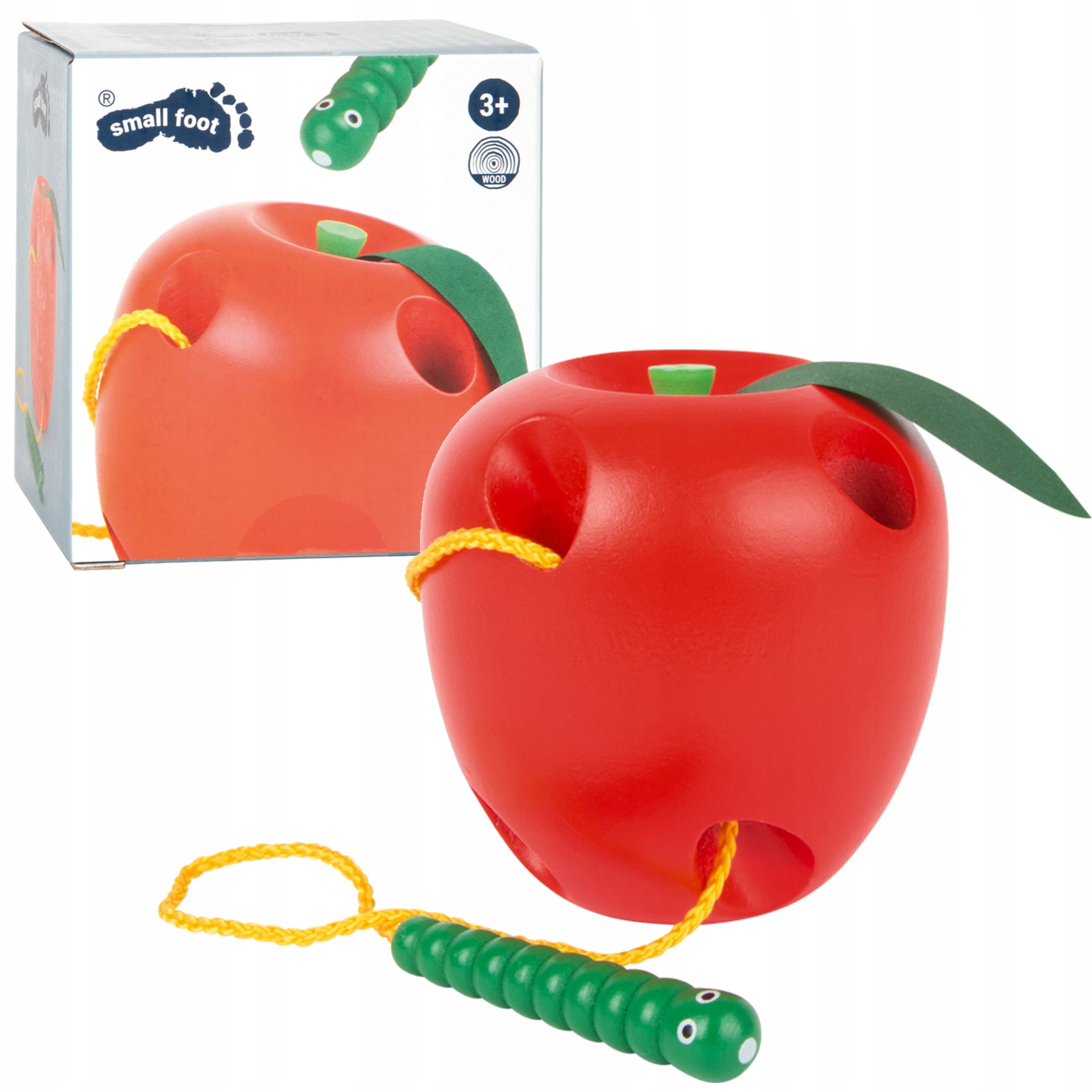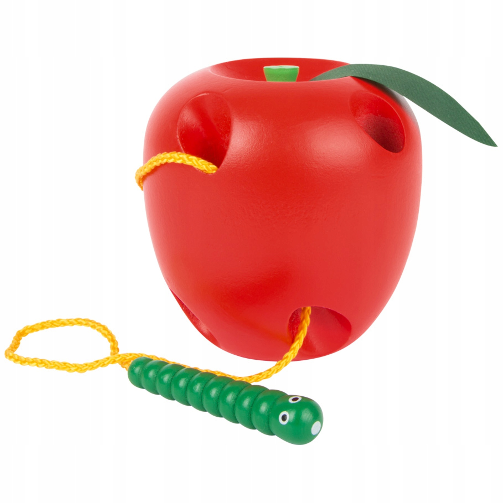 Яблуко повністю виготовлено з твердої деревини. У грі крізь дірочки в яблуці протягують веселого черв’ячка. Нитка, прикріплена до хробака, створює різні шляхи. Іграшка розвиває моторику дітей, розвиває спритність і терпіння.