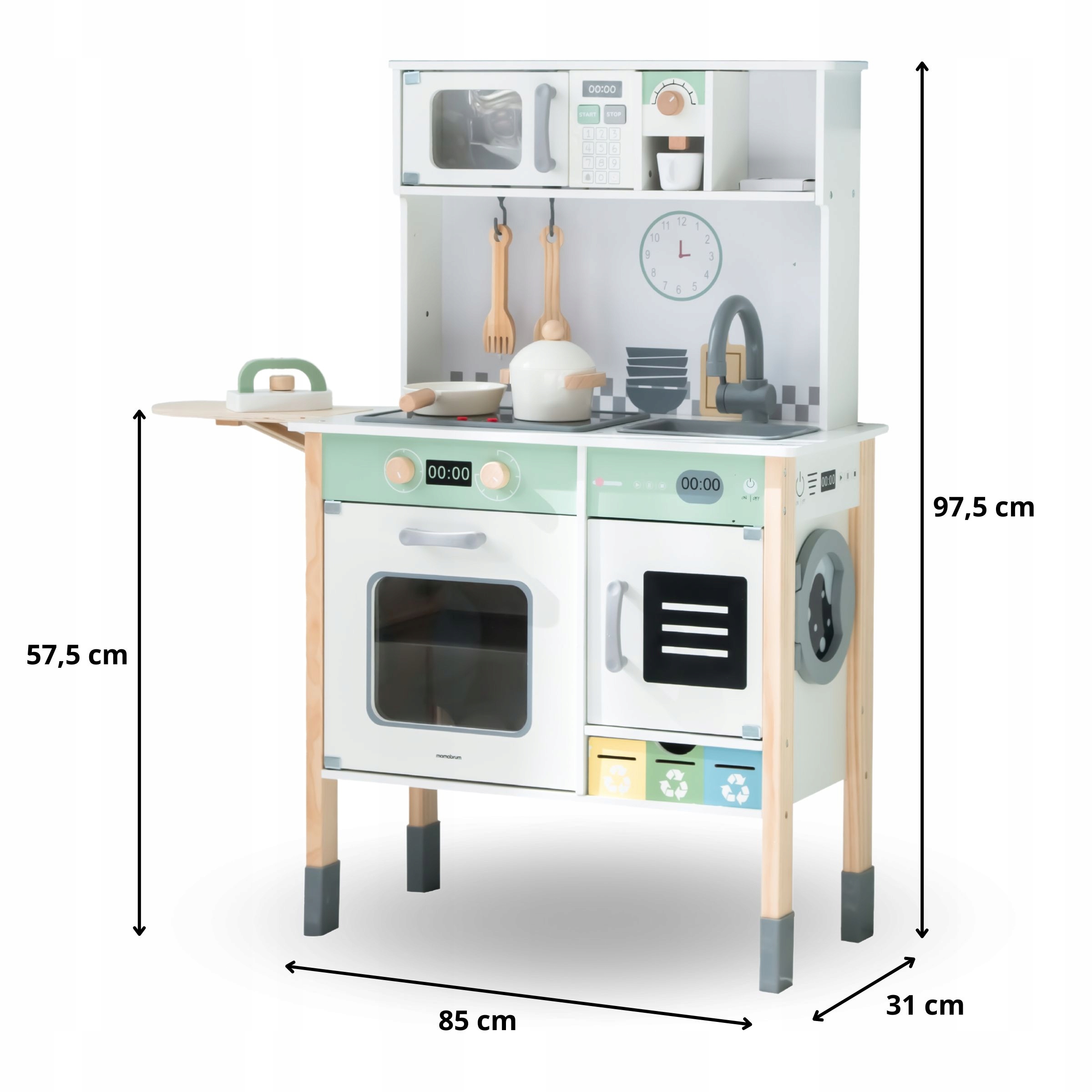 Дерев'яна дитяча кухня оснащена не тільки посудомийною та пральною машинами, а й урною для сміття з можливістю сортування сміття. На задній стінці є дошка, на якій діти можуть записувати меню або рецепти. Все це доповнюється прасувальною дошкою з праскою, мікрохвильовою піччю, раковиною та кавоваркою. Будьте впевнені, ваша дитина не буде нудьгувати!