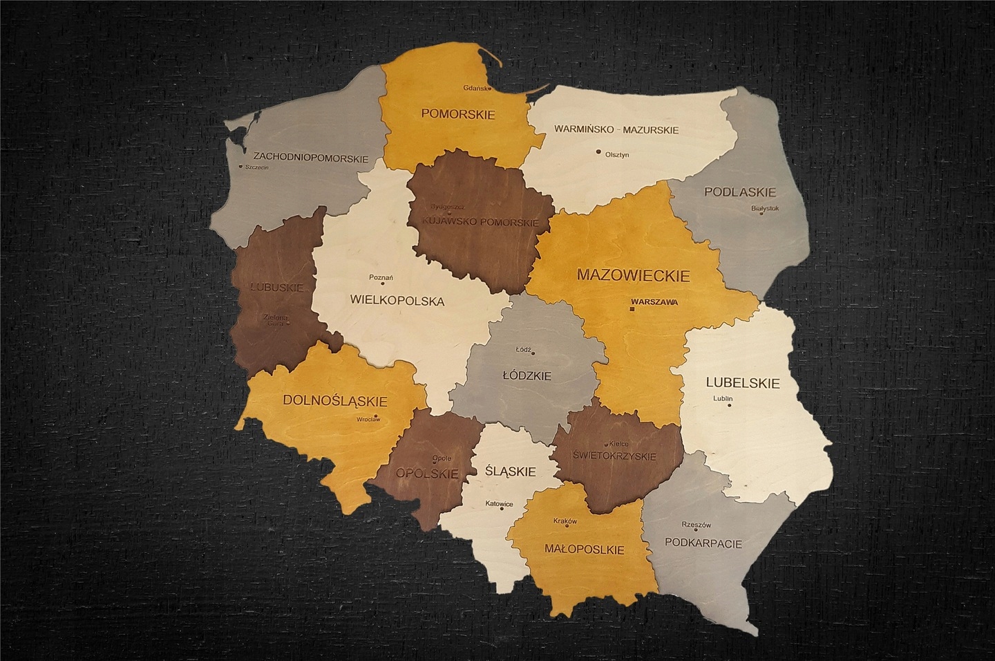 Насолоджуйтесь дерев’яною картою Польщі 3D - Карта Польщі - це фантастичне доповнення до будь -якого інтер'єру. Завдяки використанню чотирьох різних товщин 3/4/5/6 мм деревини та різноманітності кольору різних шарів, карта набуває тривимірного вигляду і ідеально відповідає атмосфері кожної квартири ..