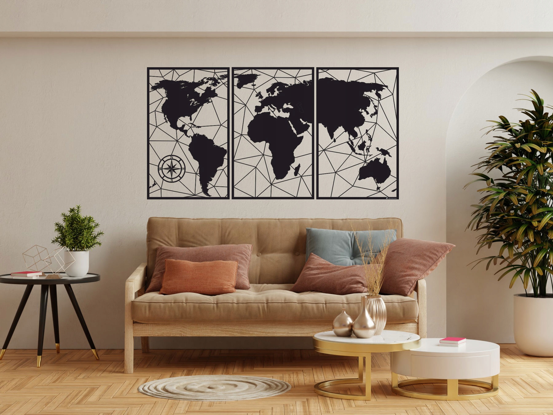Вічна елегантна карта світу з трьох частин, точно вирізана лазером у формі картини, яку можна приклеїти до стіни або повісити. Карта виготовлена з високоякісної дерев'яної плити HDF товщиною 3 мм, що надає їй чудового 3D ефекту.