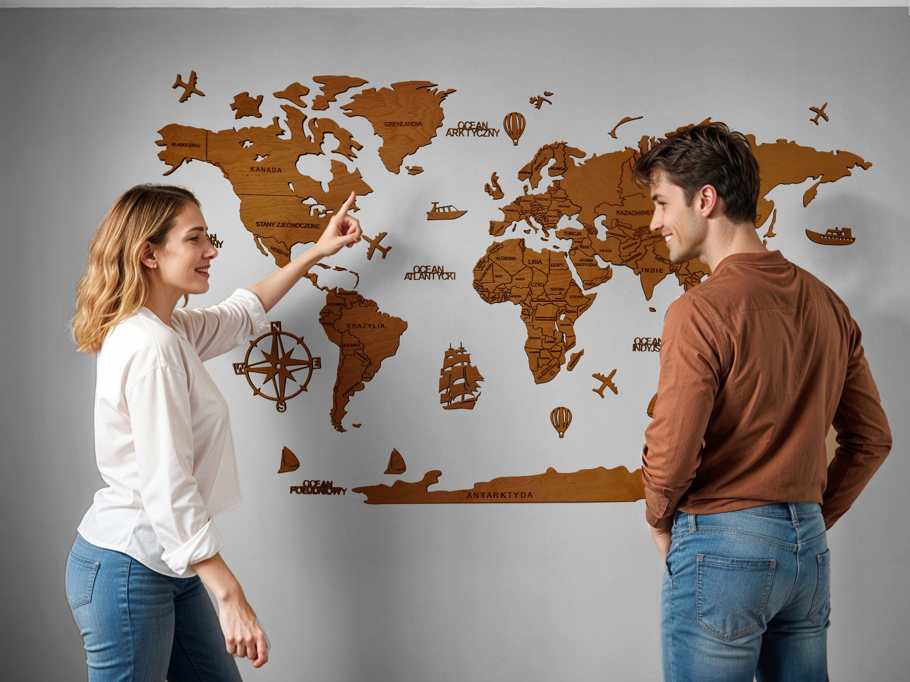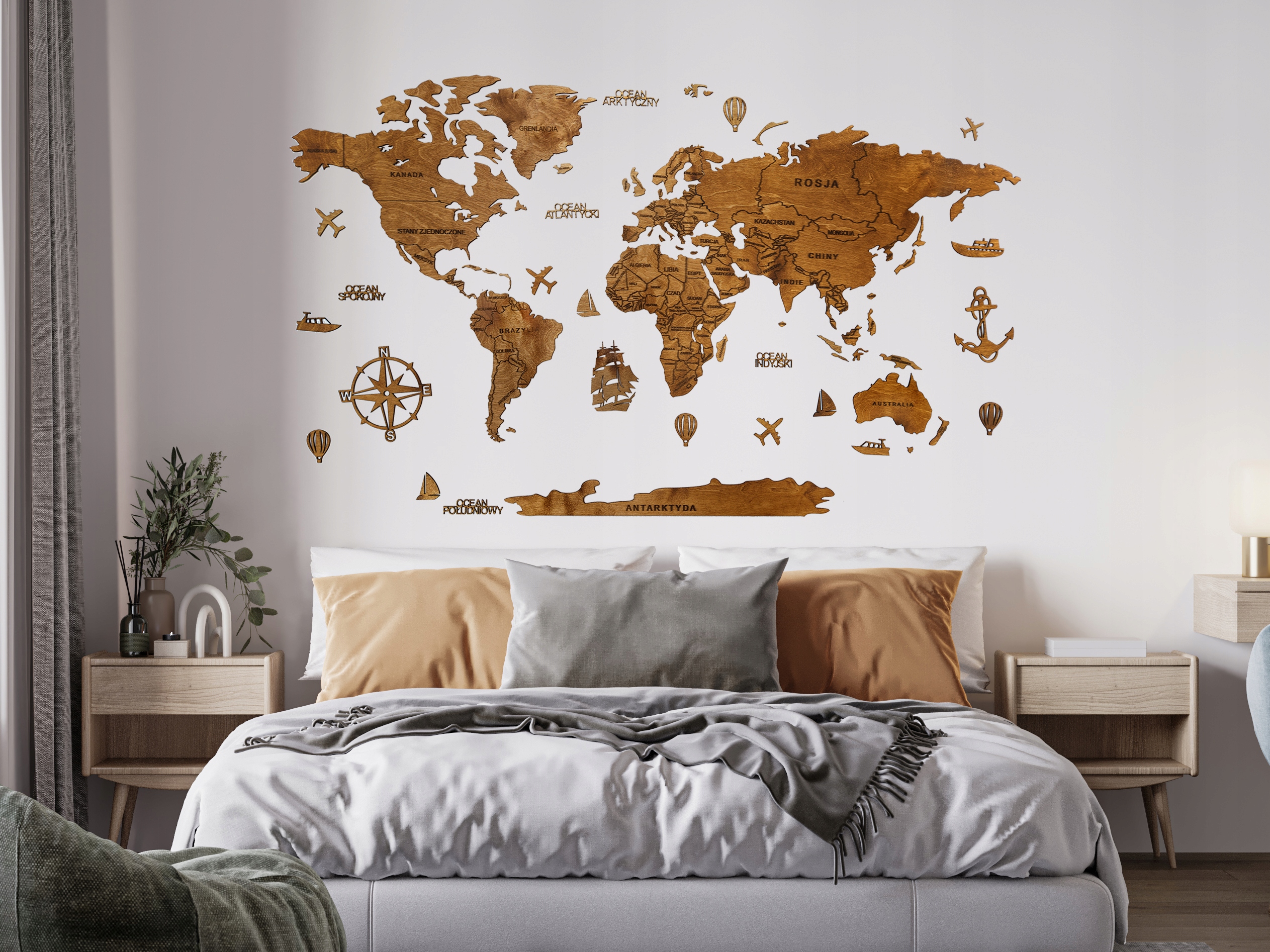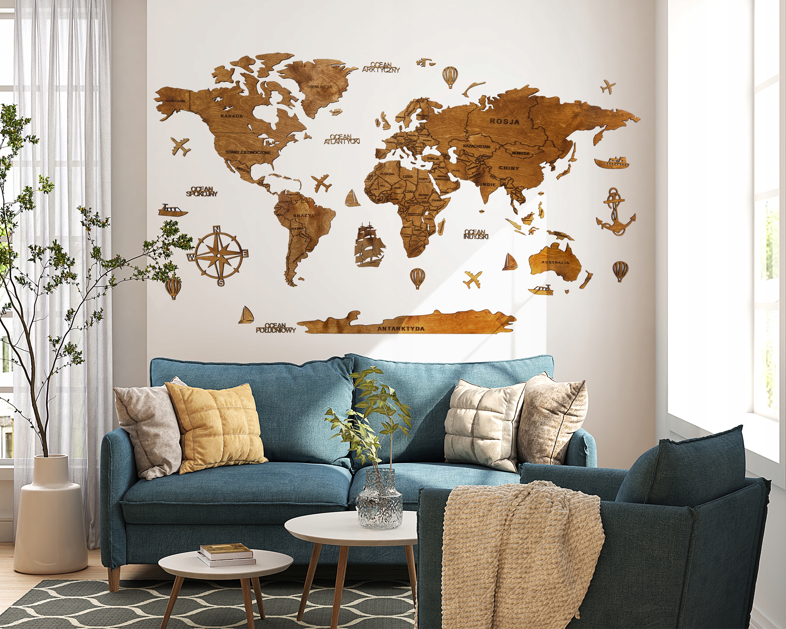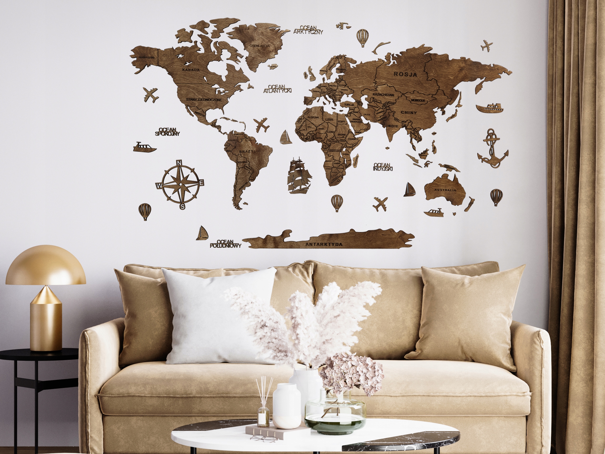 Дерев'яна карта з гравіюванням - чудовий подарунок для кожного любителя подорожей. Ця оригінальна прикраса для стін додасть кімнаті незвичайну атмосферу, стимулюватиме вашу уяву та допоможе спланувати чудові подорожі. Він також ідеально підходить для дитячої кімнати, завдяки йому дитина швидко вивчить розташування окремих країн.