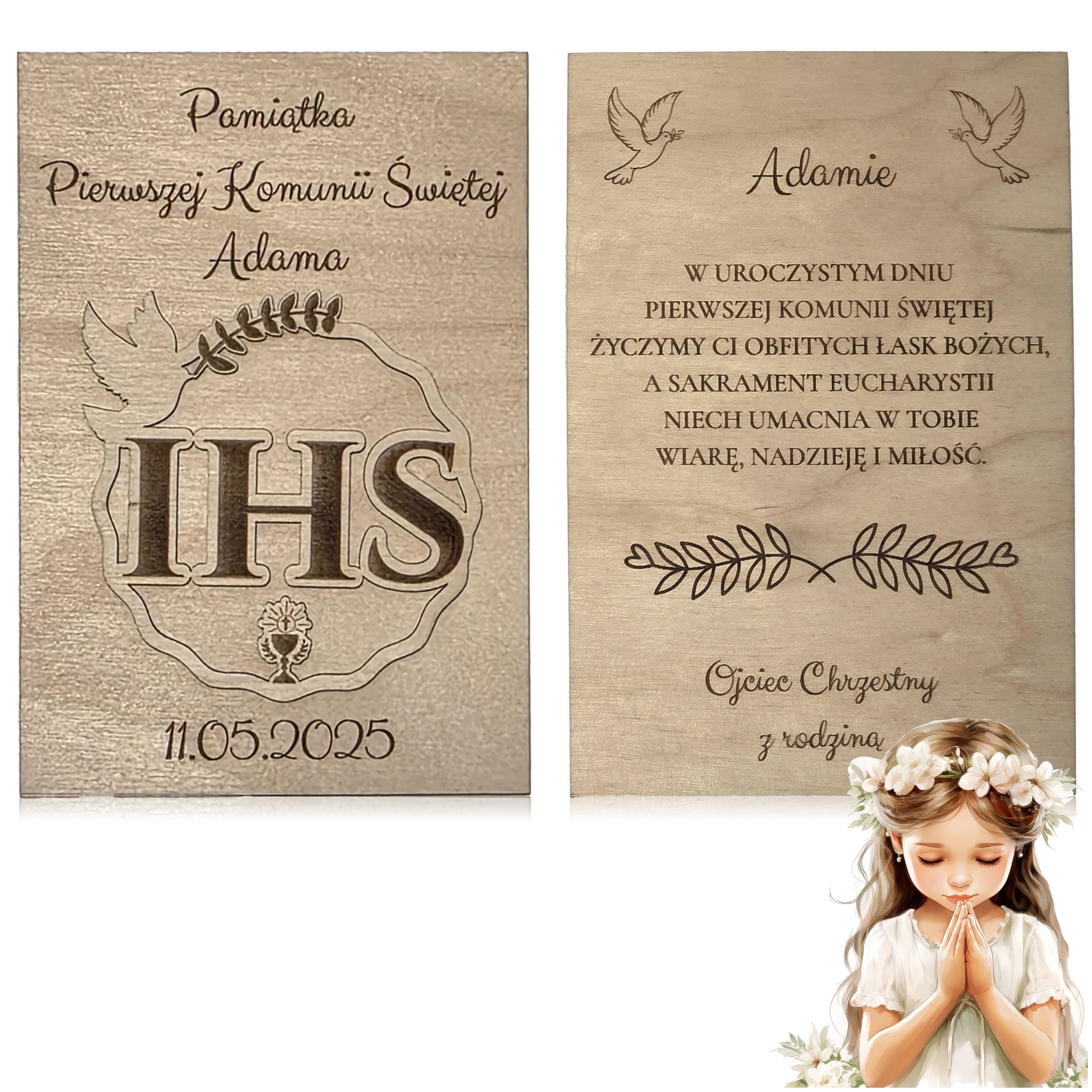 Вшановуйте особливий день першого святого спілкування з нашою елегантною карткою з фанери. Це чудовий спосіб висловити свої найкращі побажання в цей особливий день. Картка повністю персоналізована , тому ви можете додати ім'я дитини, дату причастя або спеціальну відданість - це справді унікальний і сентиментальний жест.