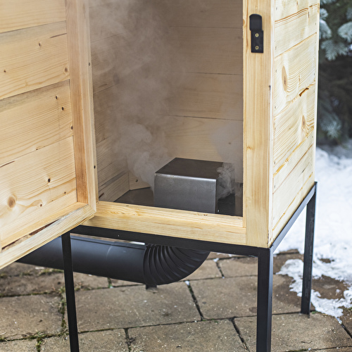 Смомовна камера виготовлена з вибраної, меленої ялинової деревини товщиною близько 2 см. Він має зручний доступ через двері, і навісний дах, що значно полегшує вставку та видалення продуктів. Тверда сталева основа з ніг забезпечує стабільну обстановку та оптимальну висоту роботи.