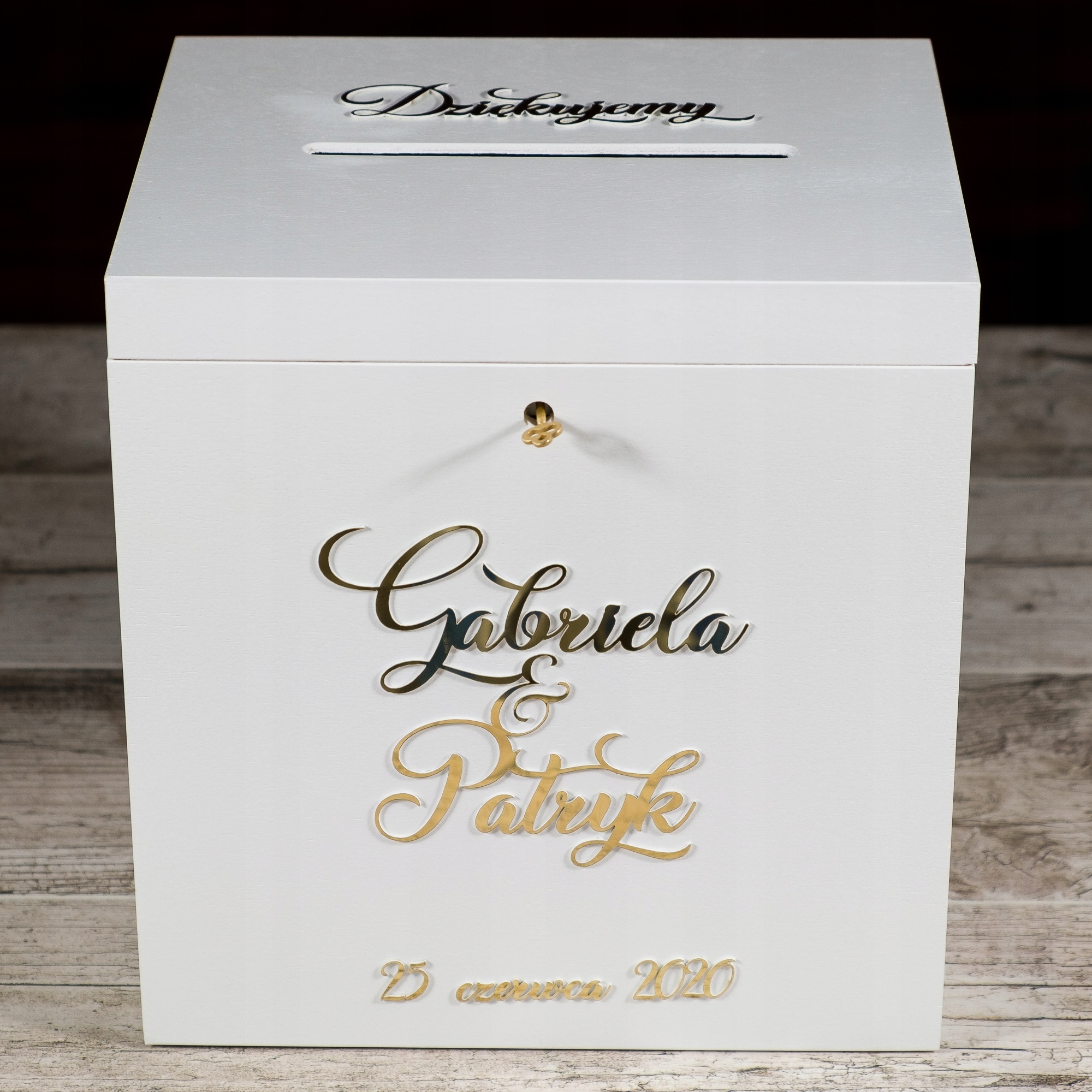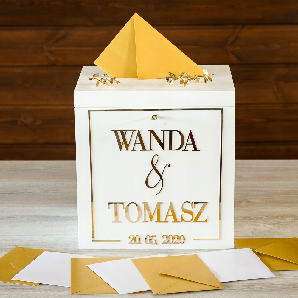 - Міцна конструкція ящика з дерева в поєднанні з красивим дзеркальним акцентом з імена нареченого та нареченої< /li>