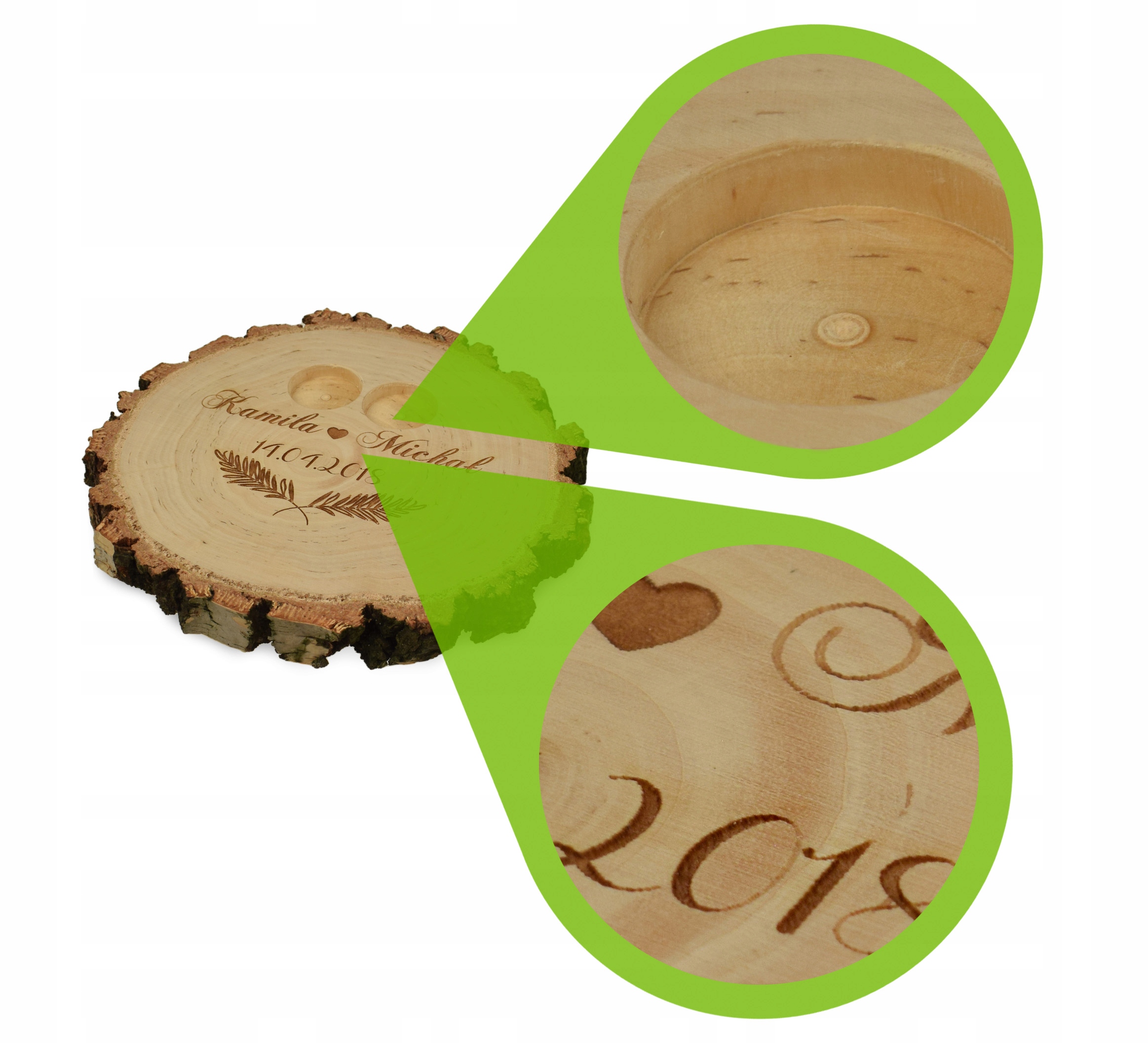Представляємо коробку/підставку для обручок з зрізу натурального дерева з індивідуальним гравіюванням.