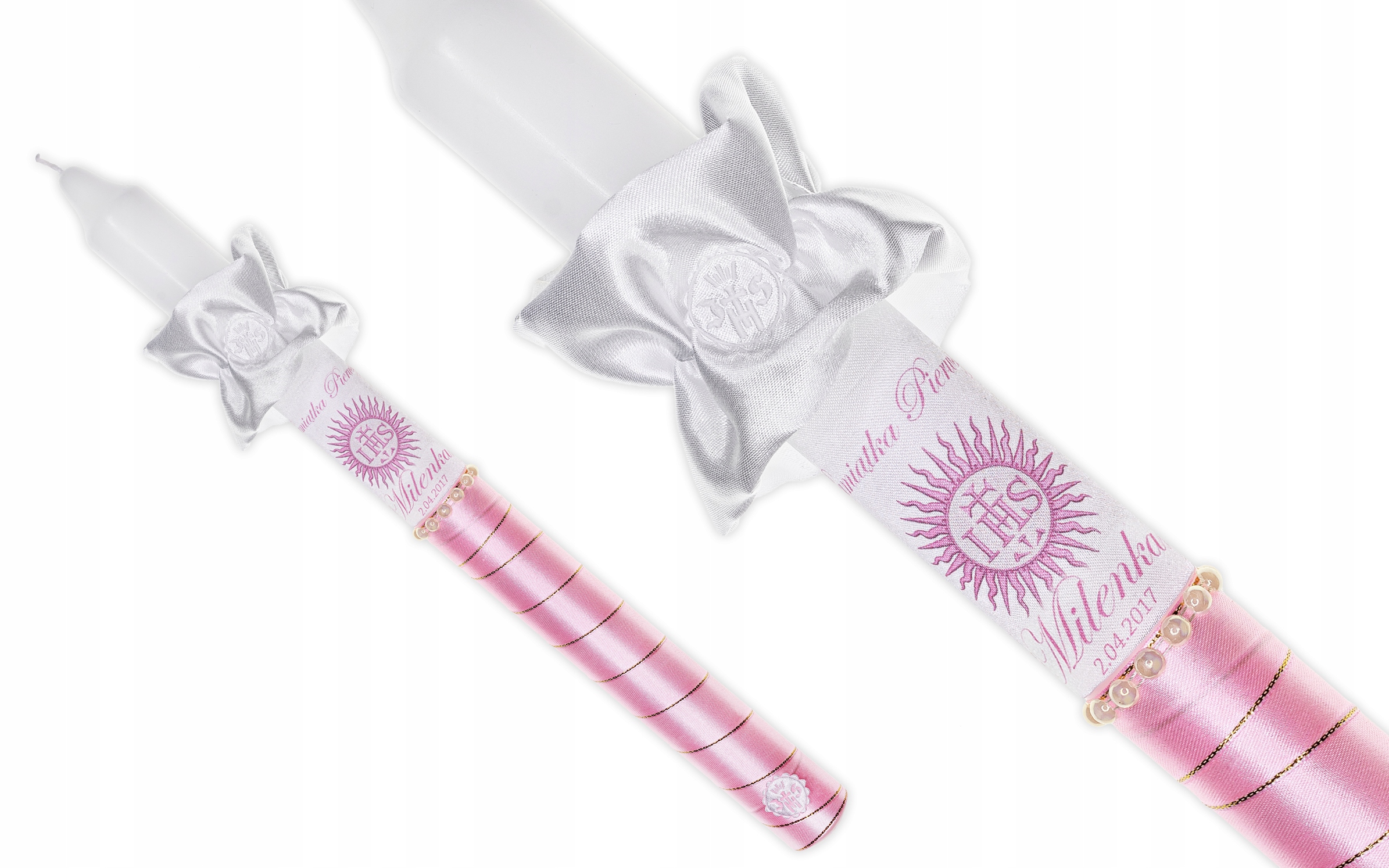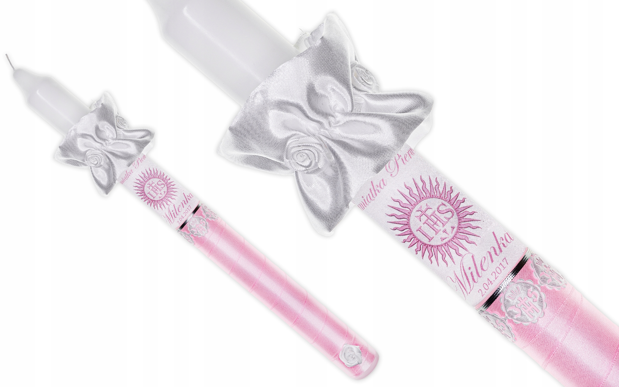 - це свічка з атласу ніжного рожевого кольору з додаванням срібної нитки та білої аплікації з символом IHS, що надає елегантності та простоти, підкреслюючи церемонія Першого Святого Причастя.