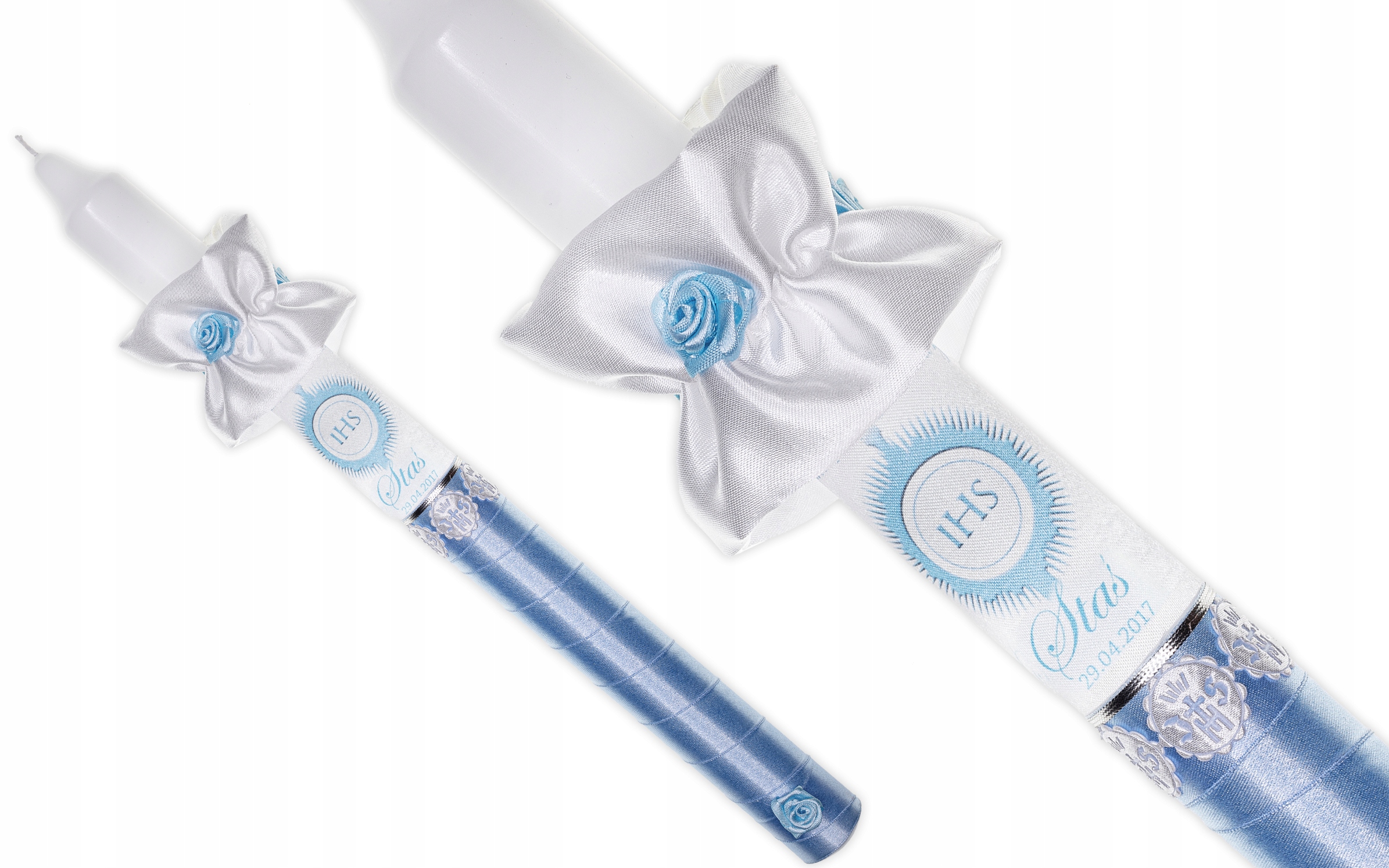 це свічка, оформлена з синього атласу з додаванням срібної нитки та білої аплікації з символом IHS, що надає елегантності та простоти, підкреслюючи Перше Святе Причастя церемонія.